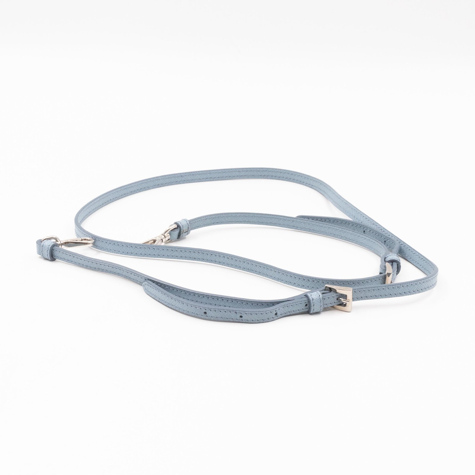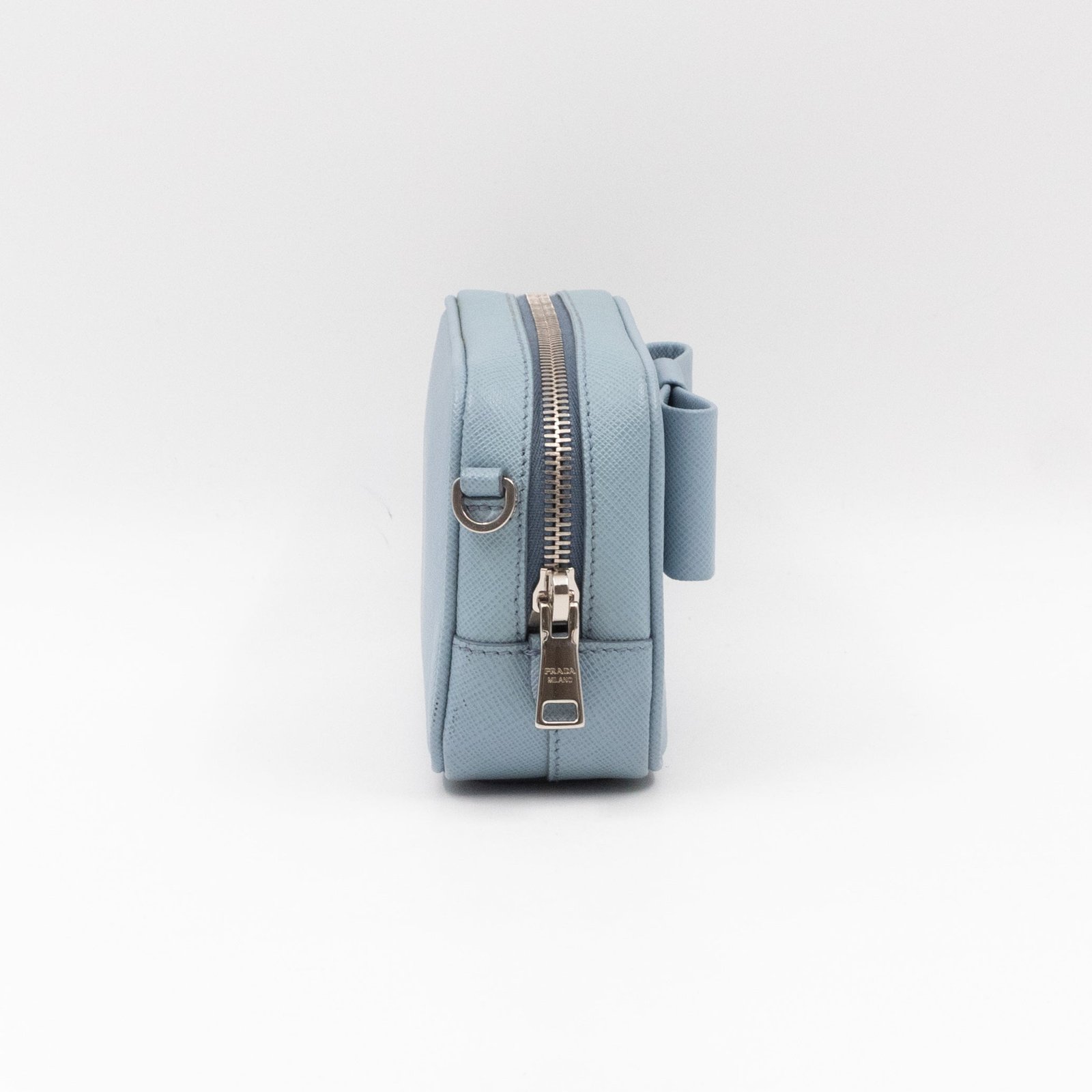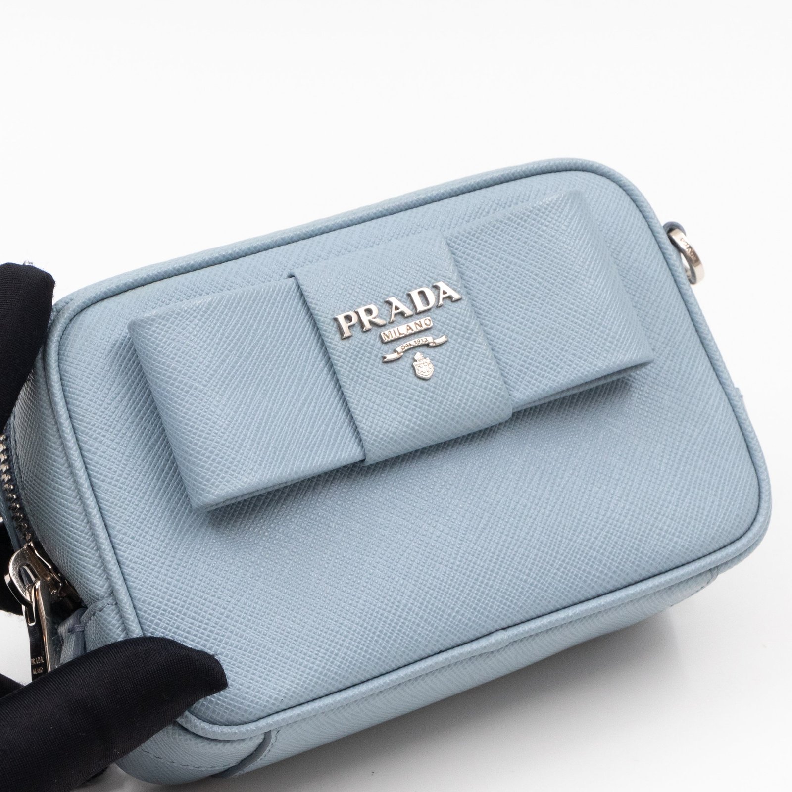 A Prada crossbody camera bag in light blue saffiano leather. This small sized bag has a removable shoulder strap for comfortable crossbody use. Great for daily use for your phone, cards, and keys. Inside has two slim pockets. On front a silver Prada logo on a lovely bow. Inside fits a phone with max length is 14 cm.