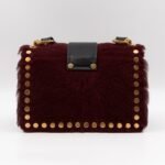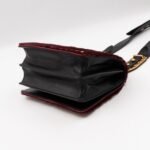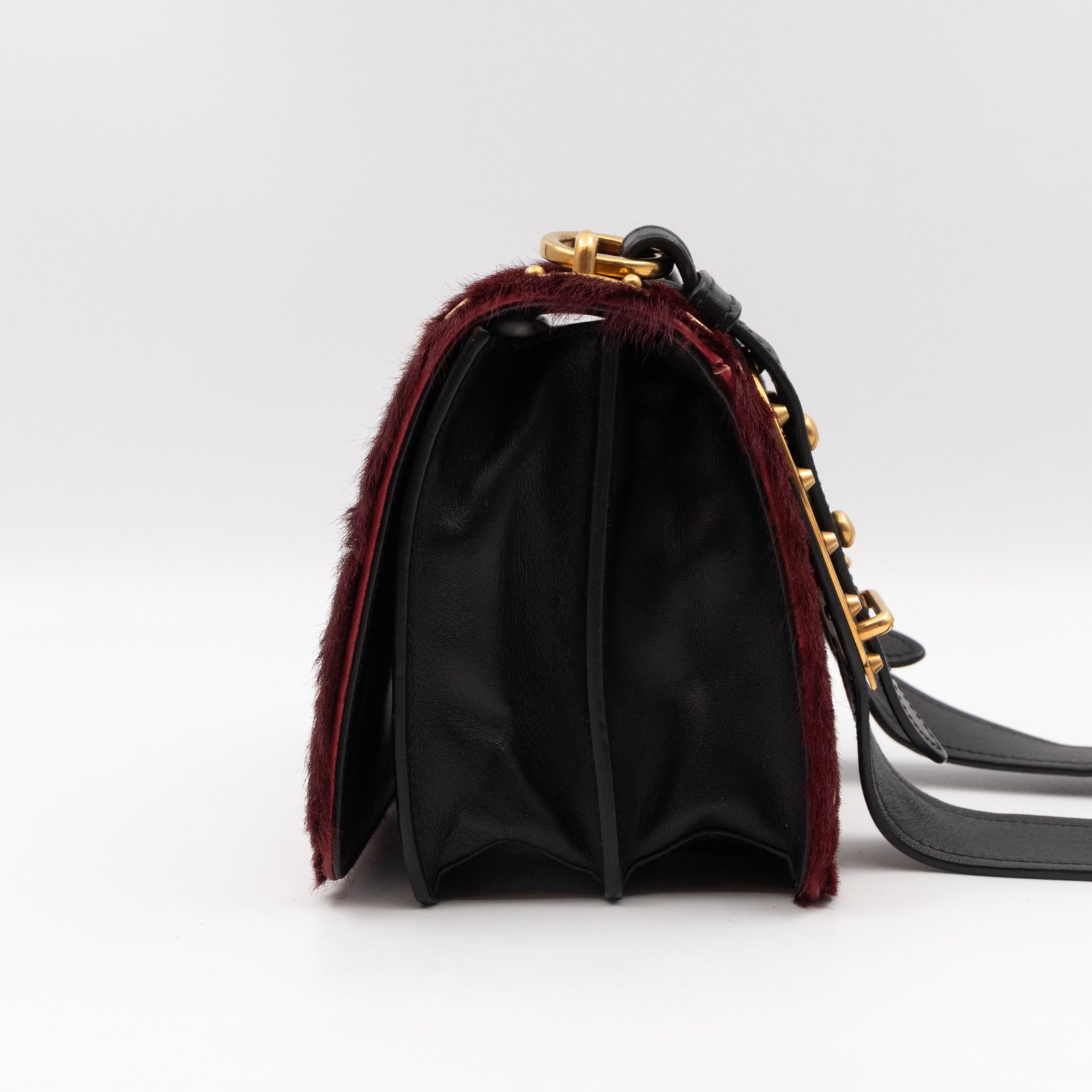 The elegant Cahier bag from Prada is a classic beauty. This stylish crossbody bag is crafted of calf hair in dark red with calfskin leather in black. The bag features an adjustable black leather shoulder strap and aged brass hardware including corner plates and a closure. The crossover flap is covered in burgundy pony hair and opens to a partitioned black leather interior with patch pockets. This excellent shoulder bag is ideal for all of your essentials. Retail price is around €3200.
