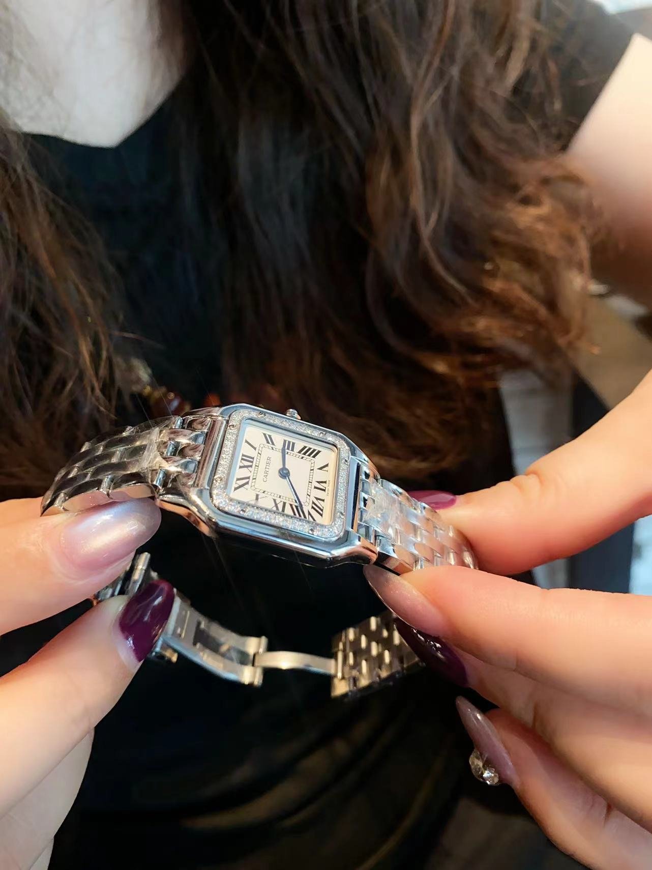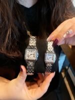 Panthère de Cartier – the Cartier Panther watch, unlike the Ballon Bleu, won’t be as commonly seen, but its recognition is high. It is glamorous yet free-spirited, representing the aesthetic style of the Panthère de Cartier. With smooth lines, it is captivating and gently fits the wrist, as if dancing on the skin. Its unique shape showcases a mature, elegant, and confident female image. The case is integrated, equipped with a Swiss quartz movement, 316L stainless steel case, and the crown is set with a synthetic blue spinel. The sword-shaped, blued steel hands add a special touch. Water-resistant to about 30 meters. Small size: 22*30mm, ultra-thin 6mm, unbeatable value for money, exclusive source – act fast!