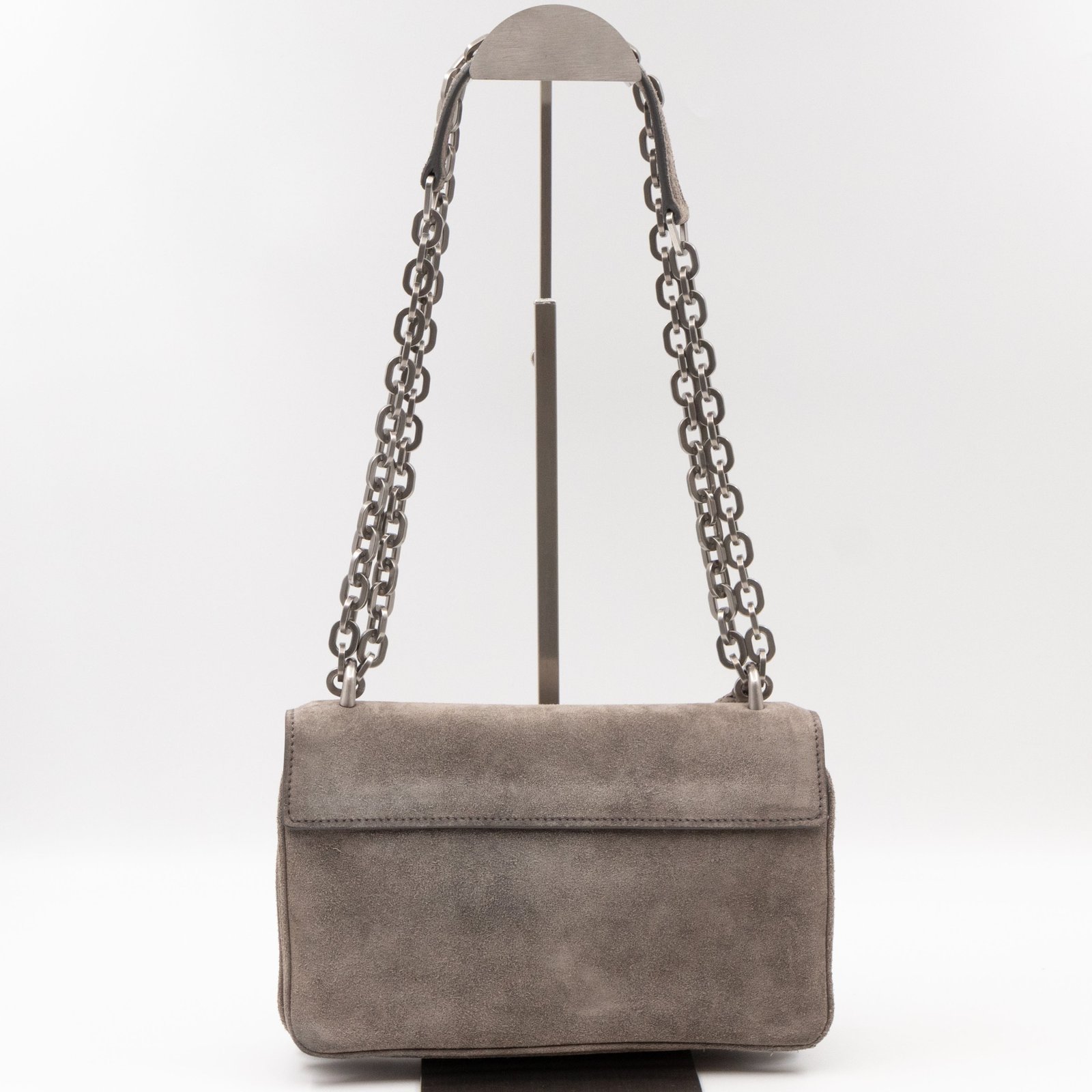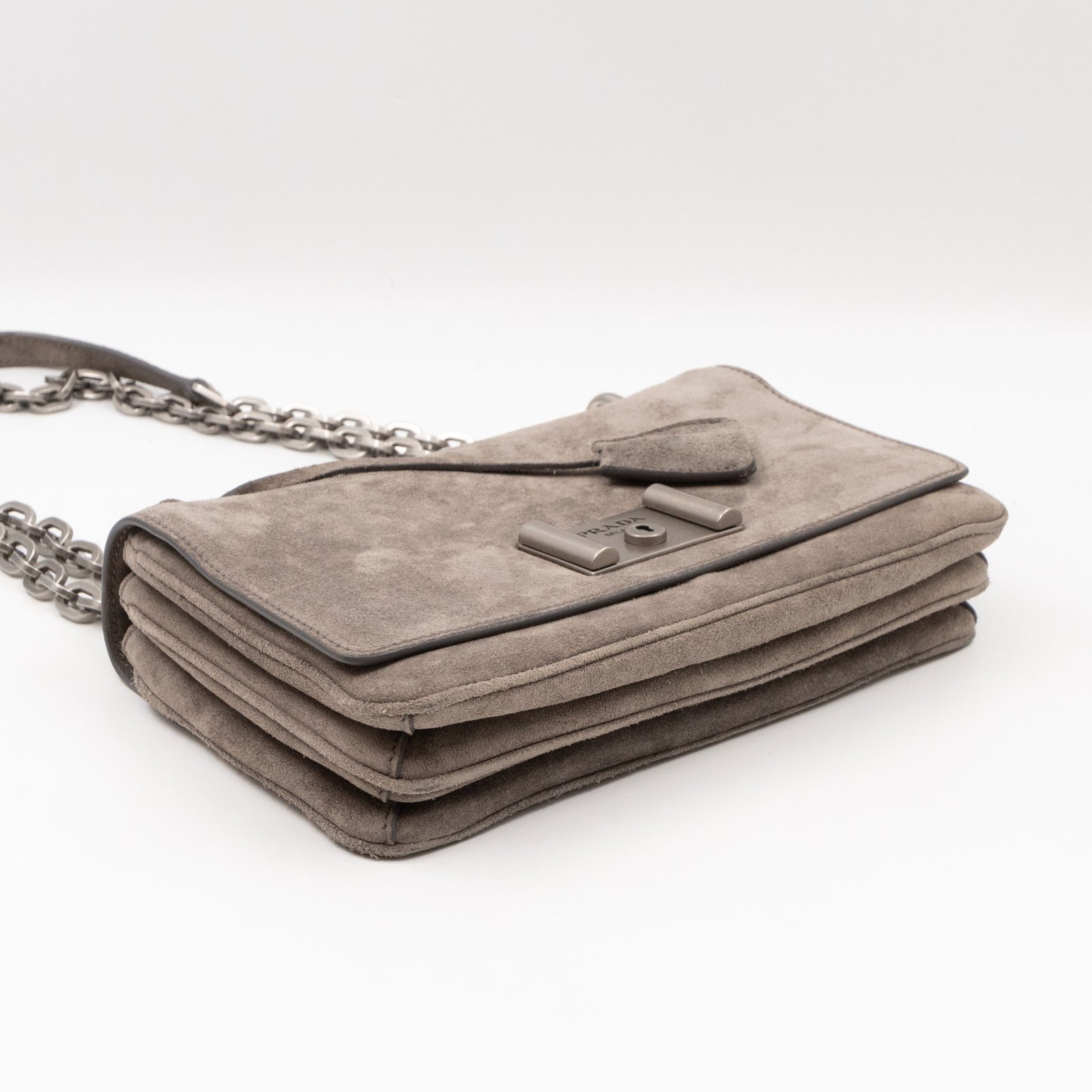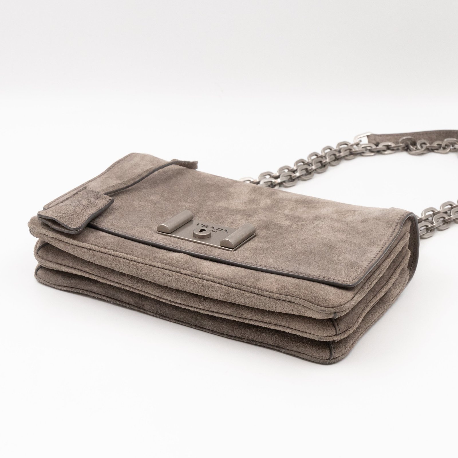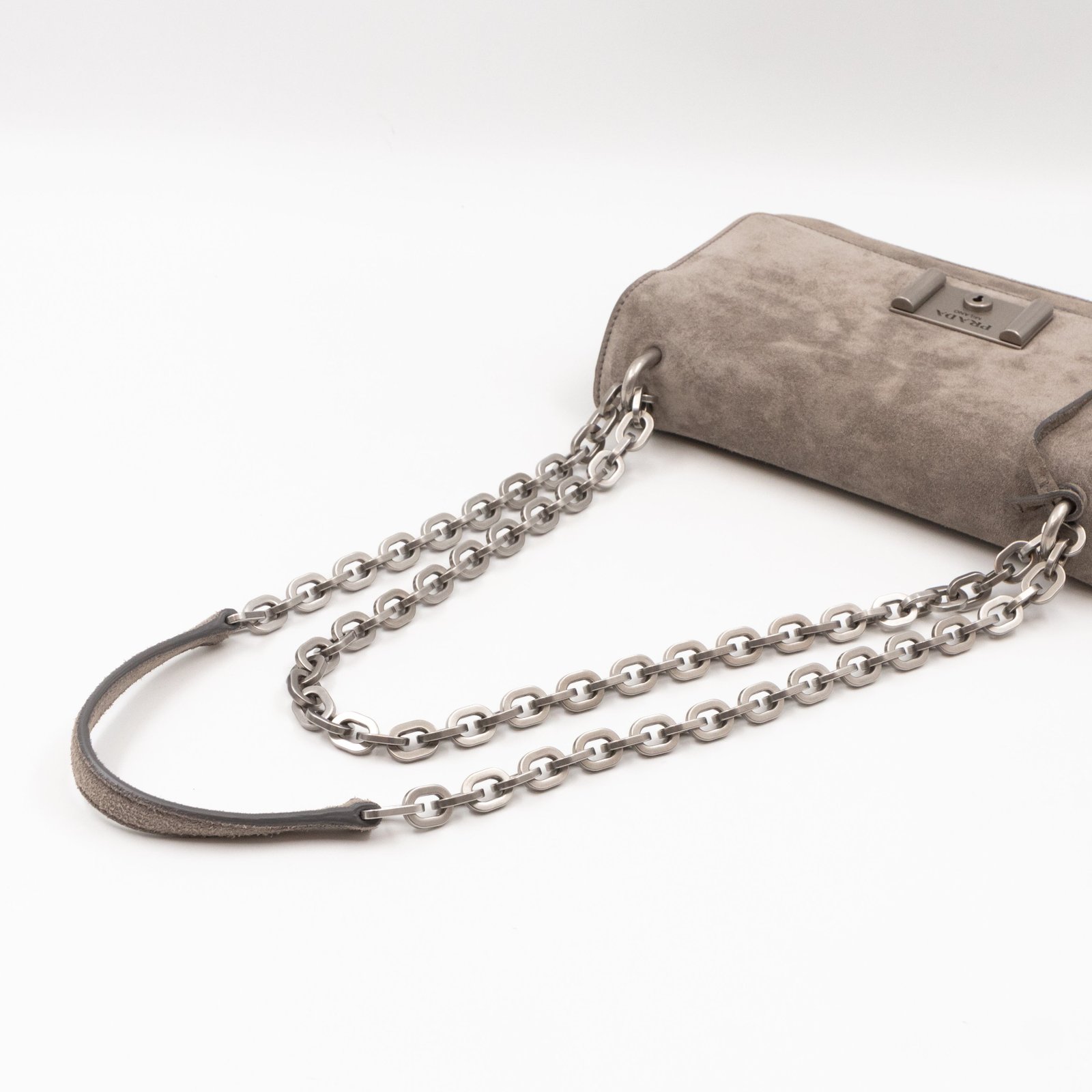 This is a Prada chain flap shoulder bag. Made in grey suede leather. The bag features a silver-tone metal flap closure and a chain link shoulder strap. The flap opens to three layers and all of which are brown smooth leather. Shoulder chain can be carried on the shoulder or crossbody.