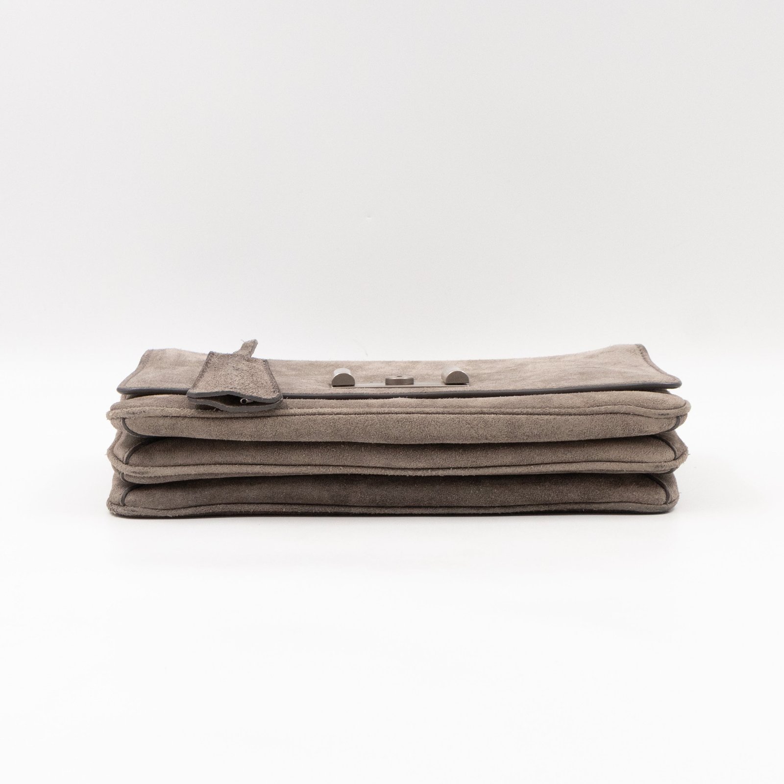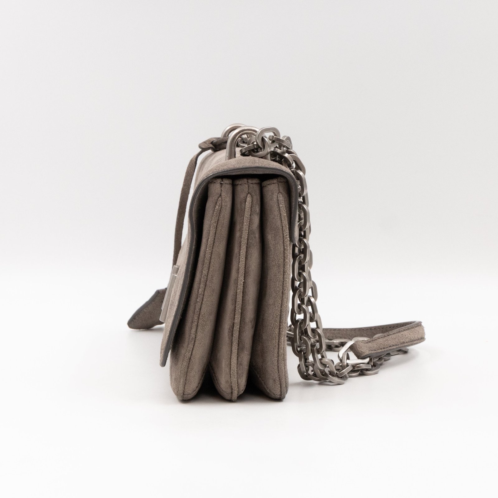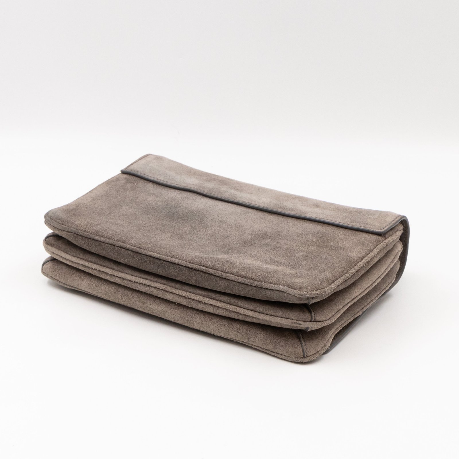 This is a Prada chain flap shoulder bag. Made in grey suede leather. The bag features a silver-tone metal flap closure and a chain link shoulder strap. The flap opens to three layers and all of which are brown smooth leather. Shoulder chain can be carried on the shoulder or crossbody.