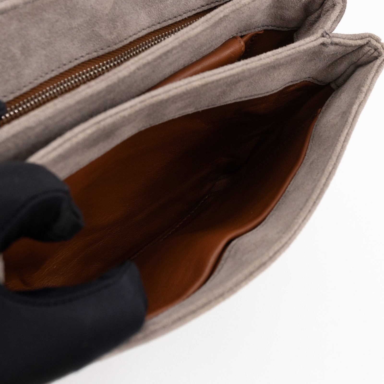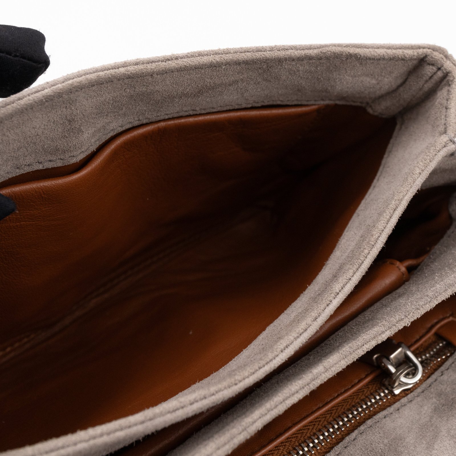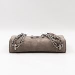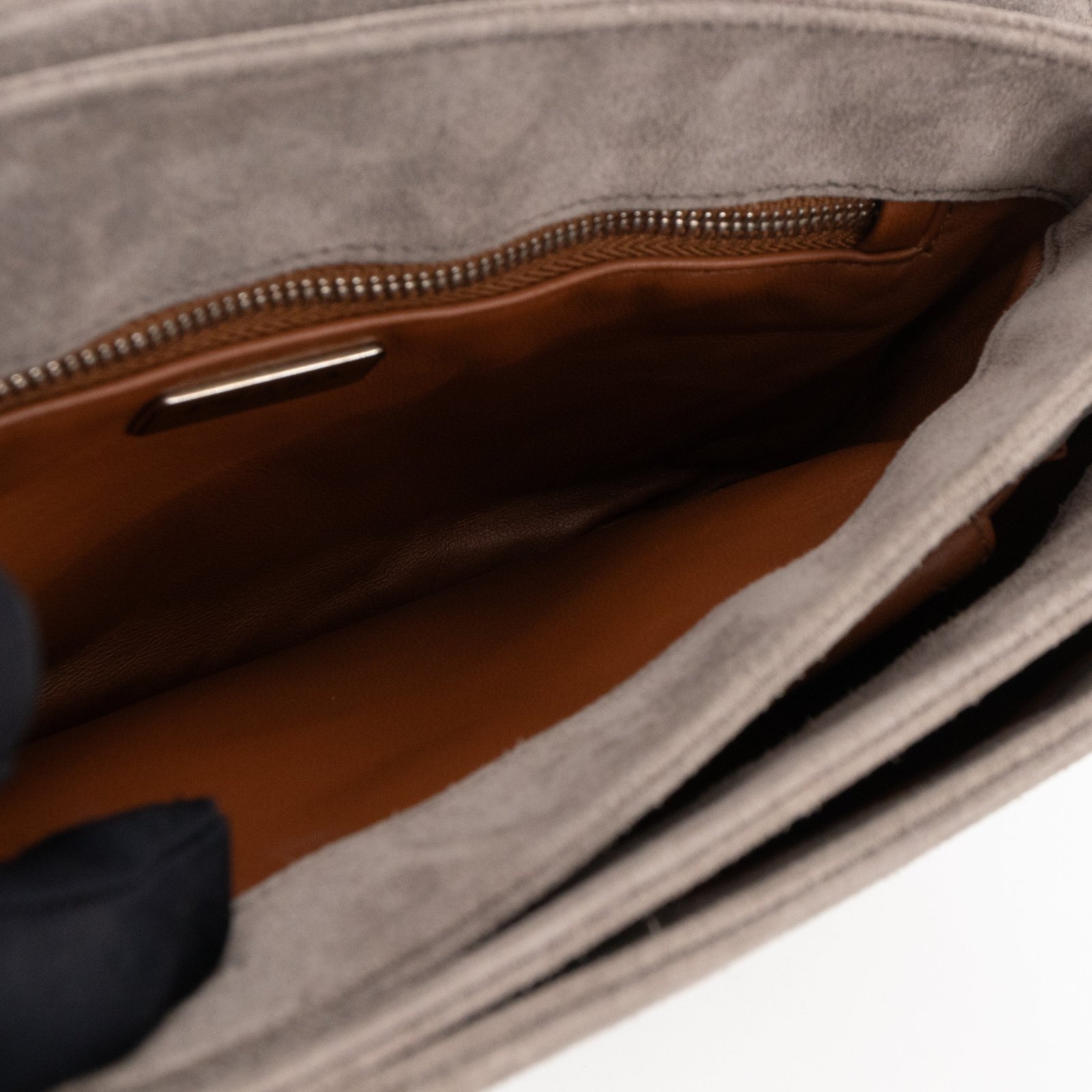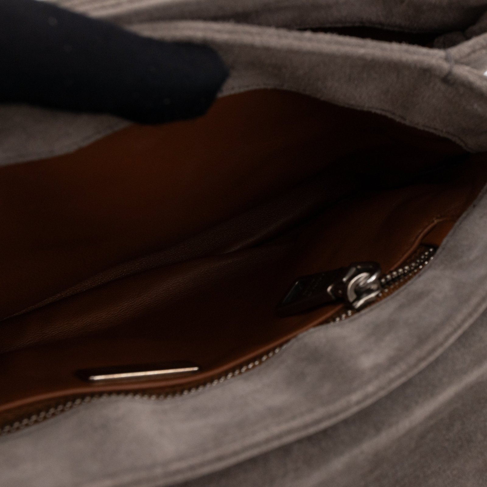 This is a Prada chain flap shoulder bag. Made in grey suede leather. The bag features a silver-tone metal flap closure and a chain link shoulder strap. The flap opens to three layers and all of which are brown smooth leather. Shoulder chain can be carried on the shoulder or crossbody.