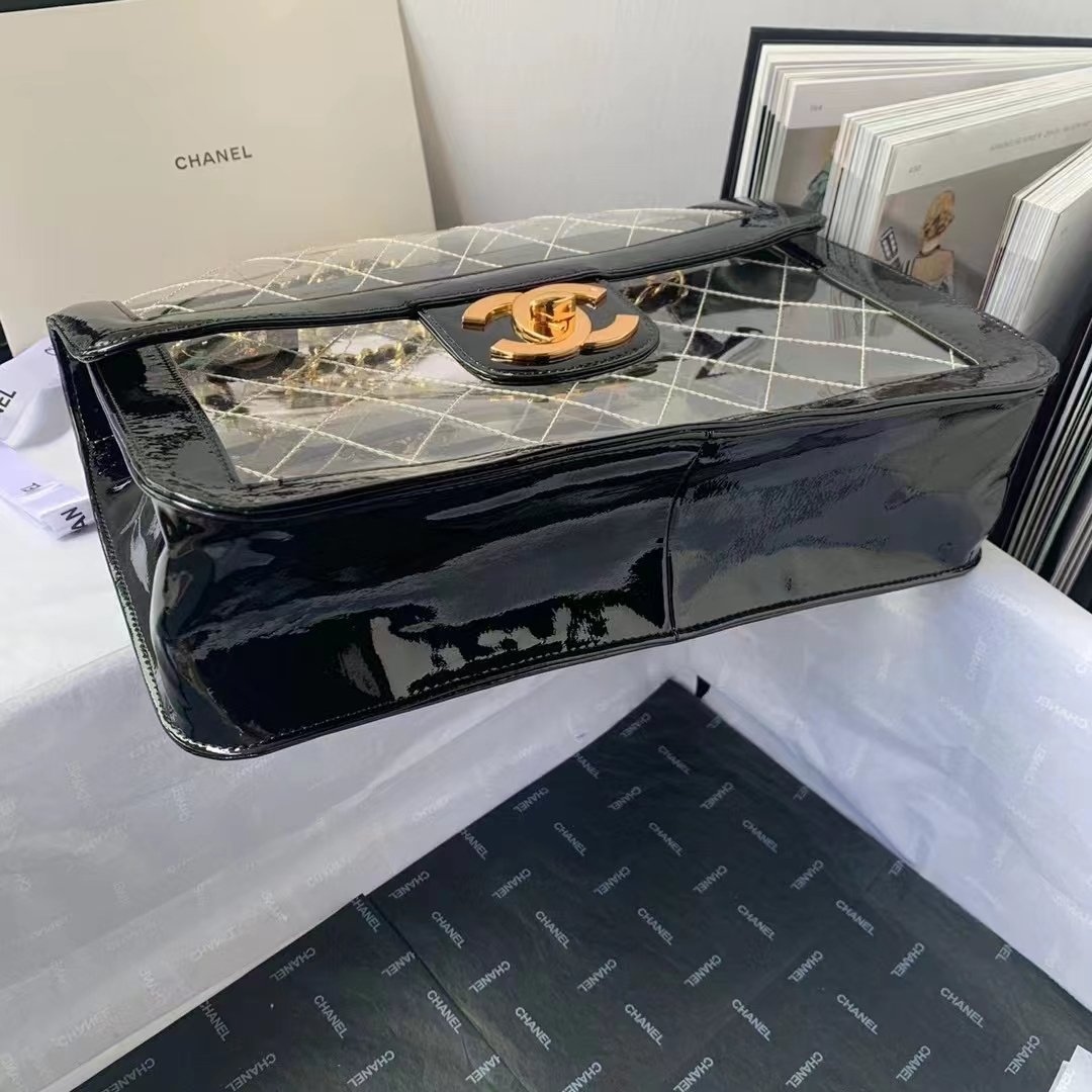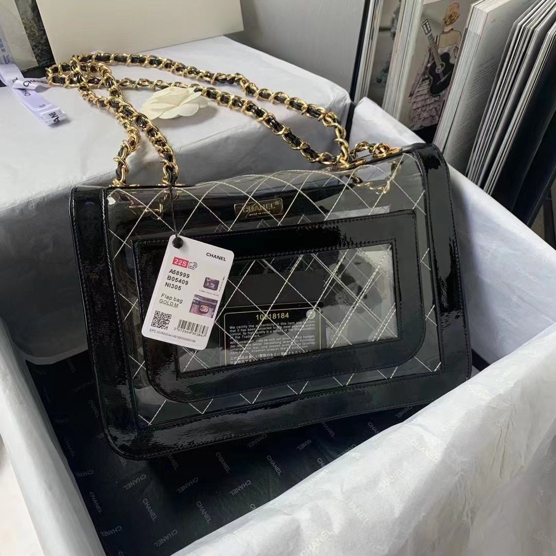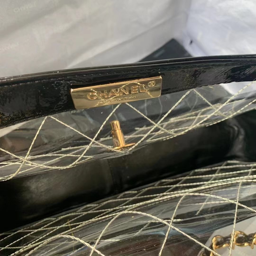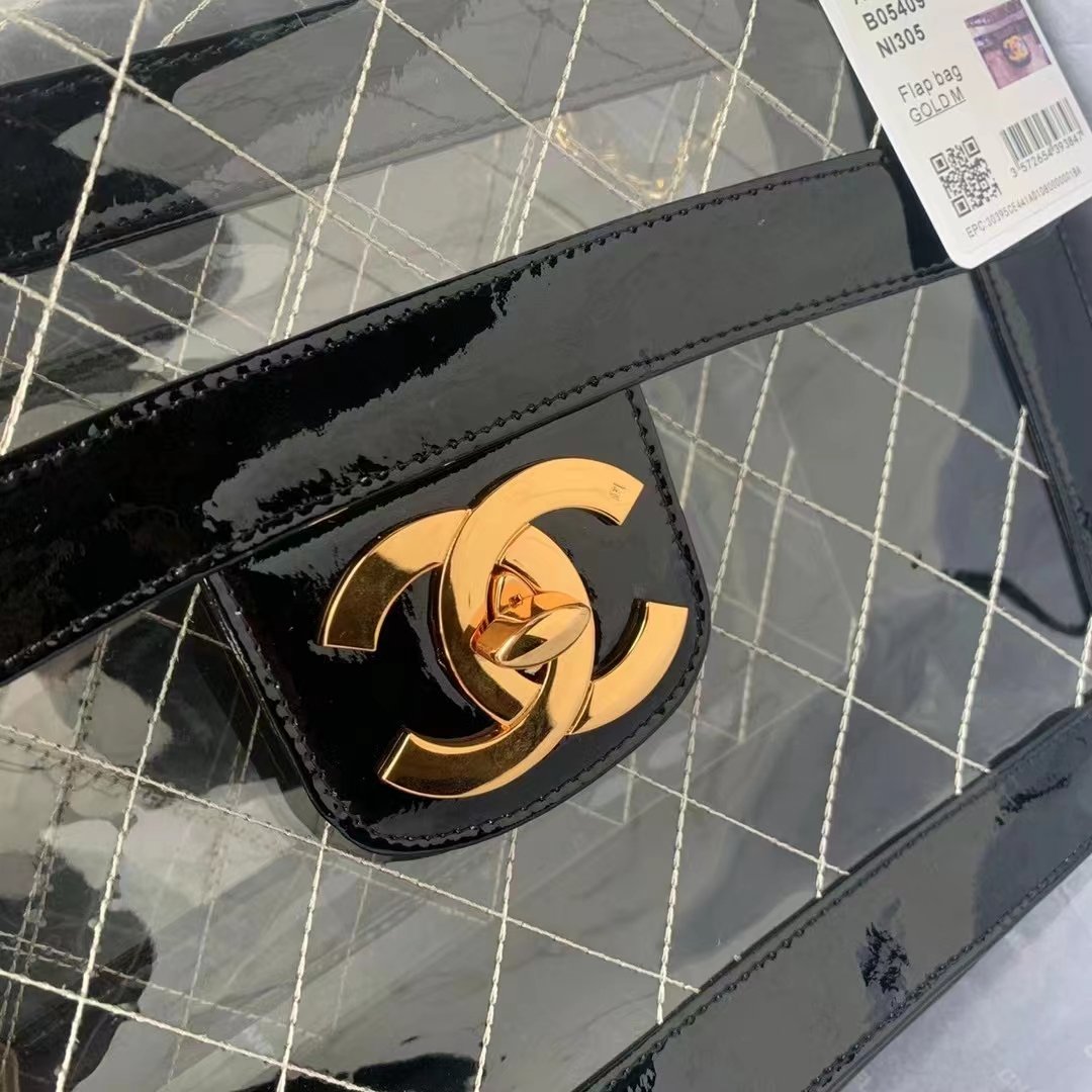 ❤️ In stock! Victoria Beckham–style transparent bag — Chanel rare/discontinued large gold-logo flap bag.