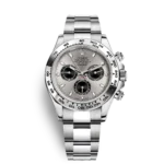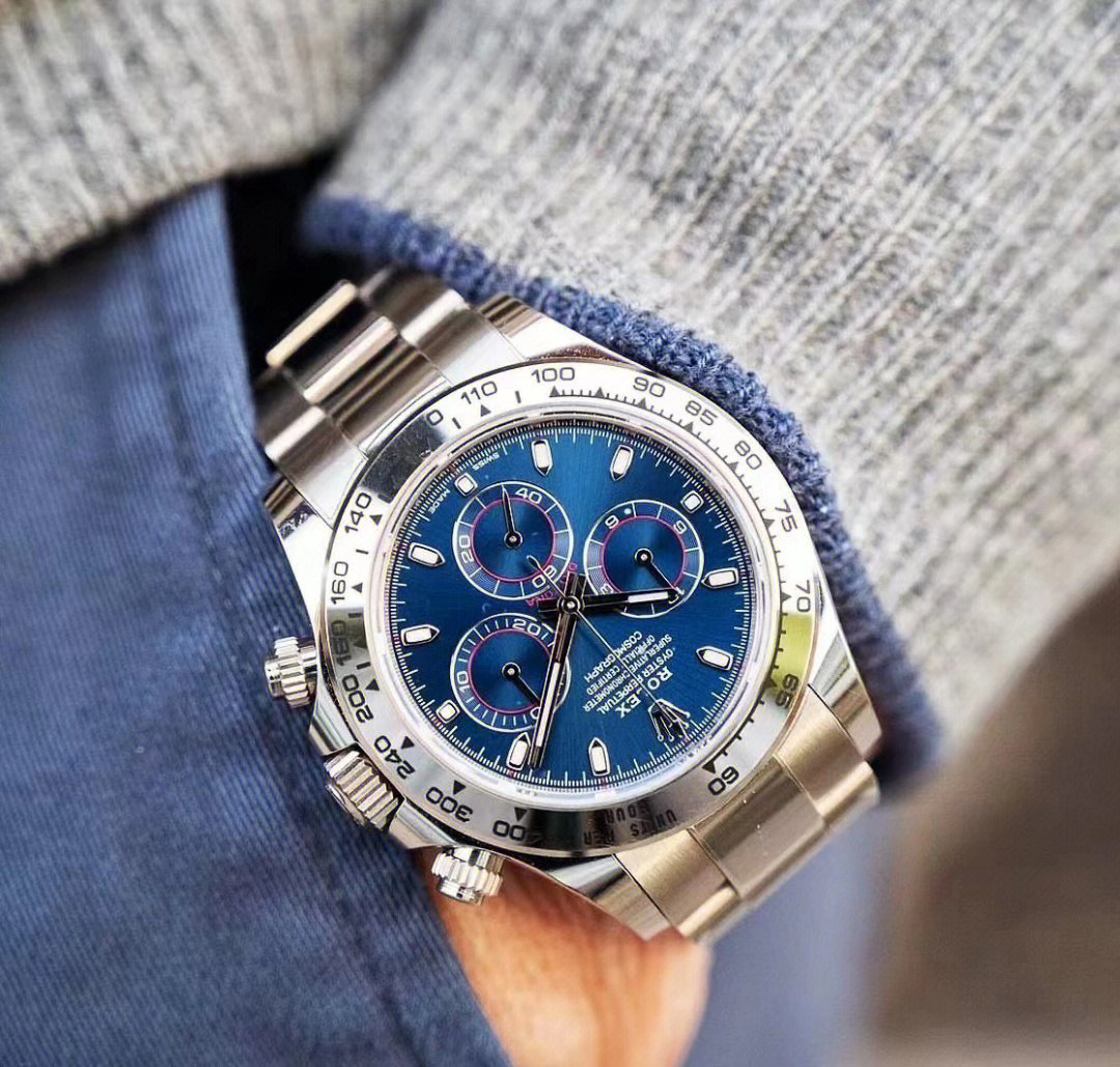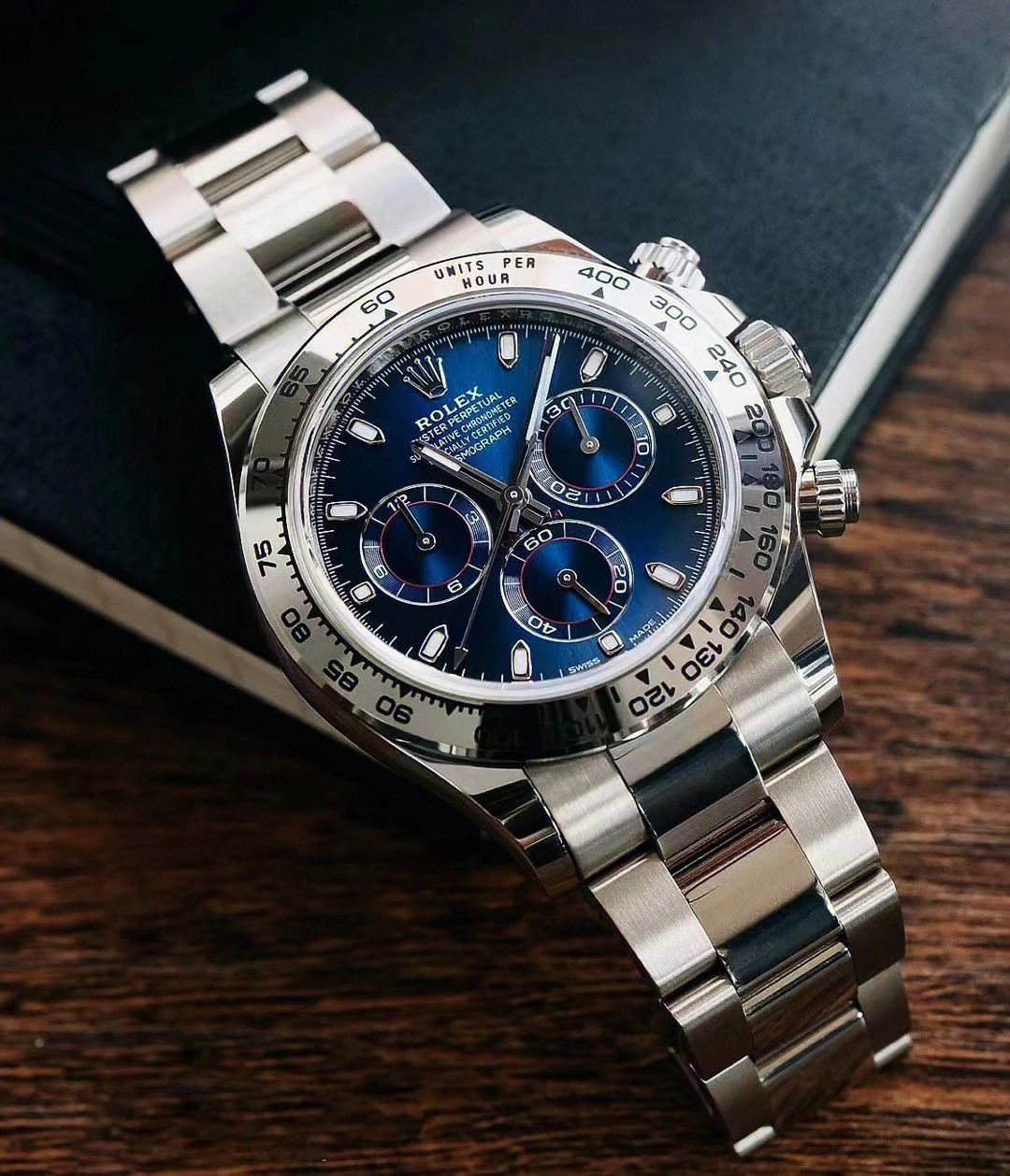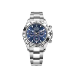 This Oyster Perpetual Cosmograph Daytona in 18 ct white gold, with a bright blue dial and an Oyster bracelet, features an 18 ct white gold bezel with engraved tachymetric scale.
