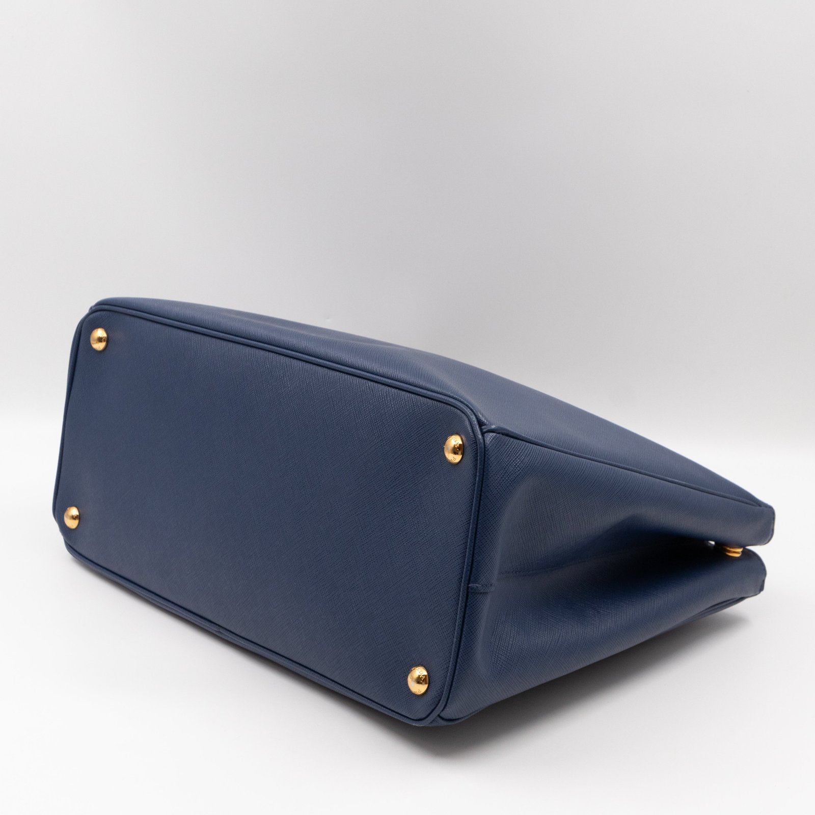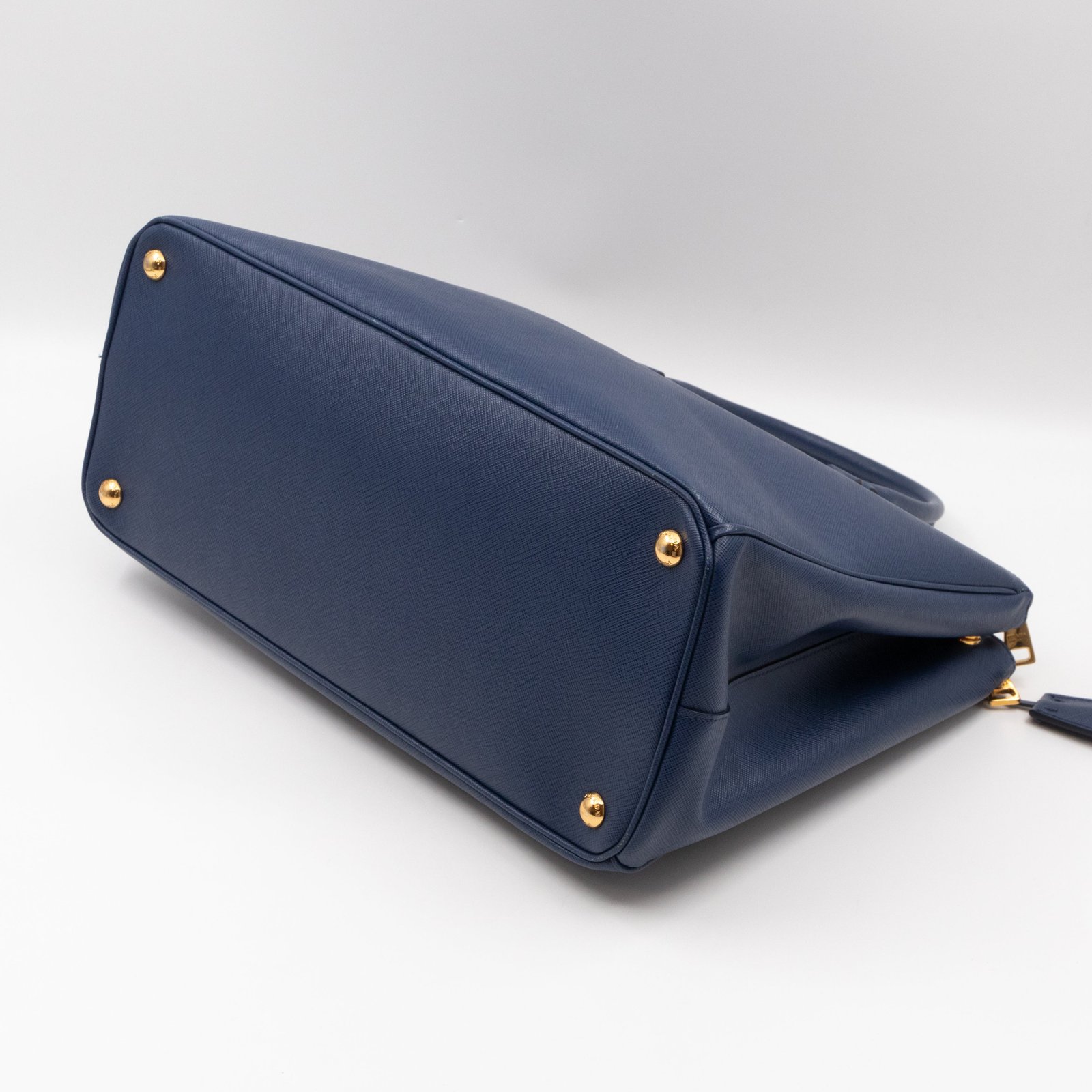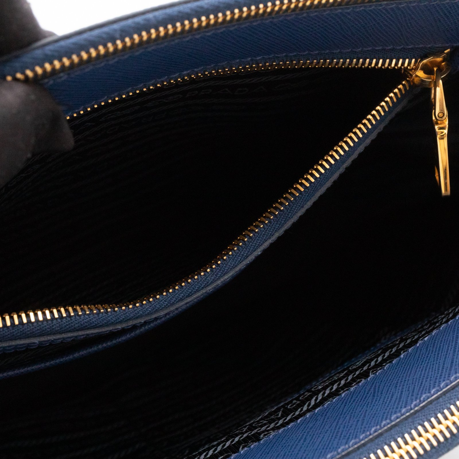 A Prada Galleria Large Double Zip bag in durable Saffiano leather. Very convenient double zipper bag in a blue color, combined with gold-tone hardware. This larger size fits your ipad, wallet, documents and even a small laptop. Great choice for daily and work use. Each side has zipper pockets, the middle compartment expands to a spacious size. Has no shoulder strap.