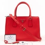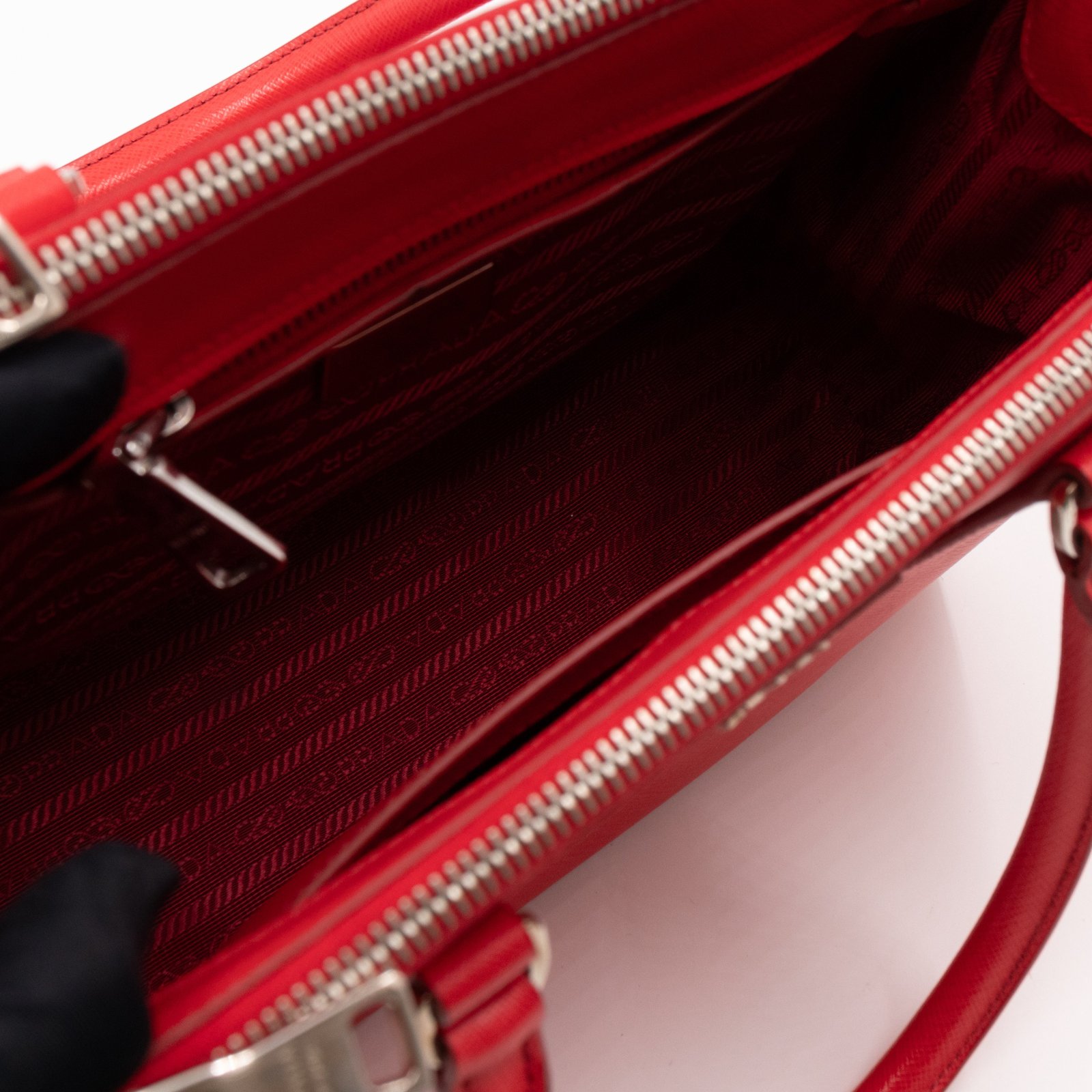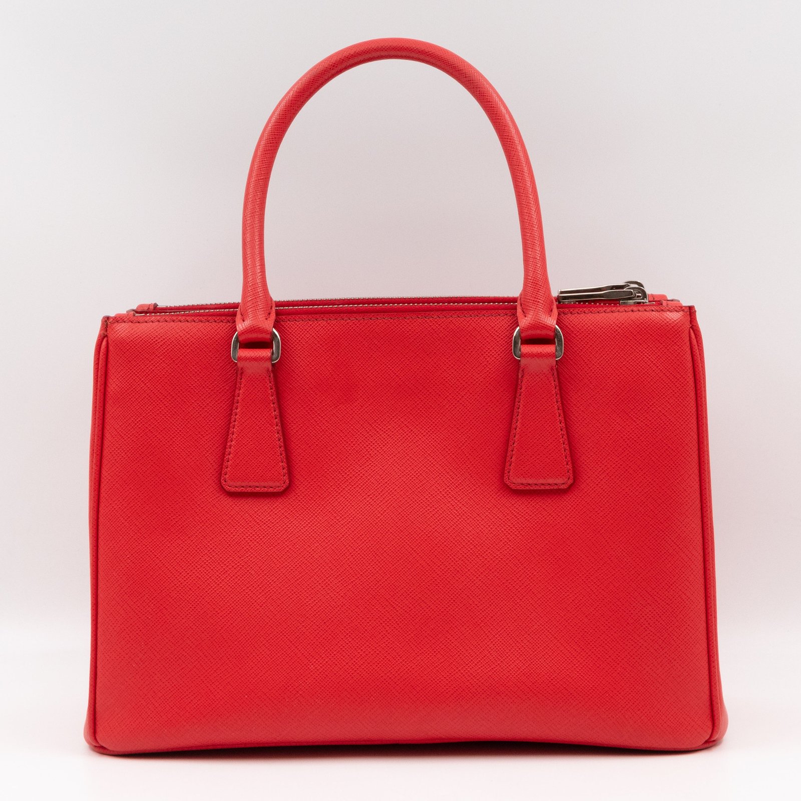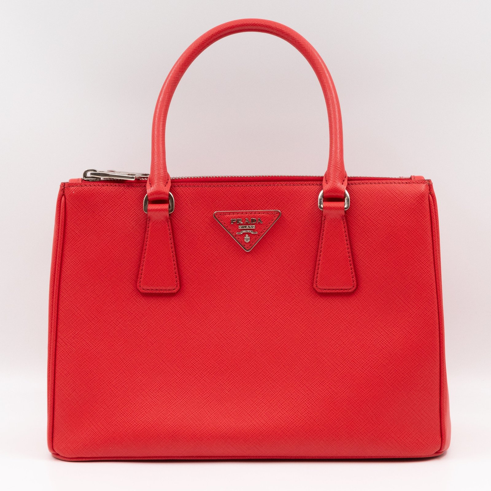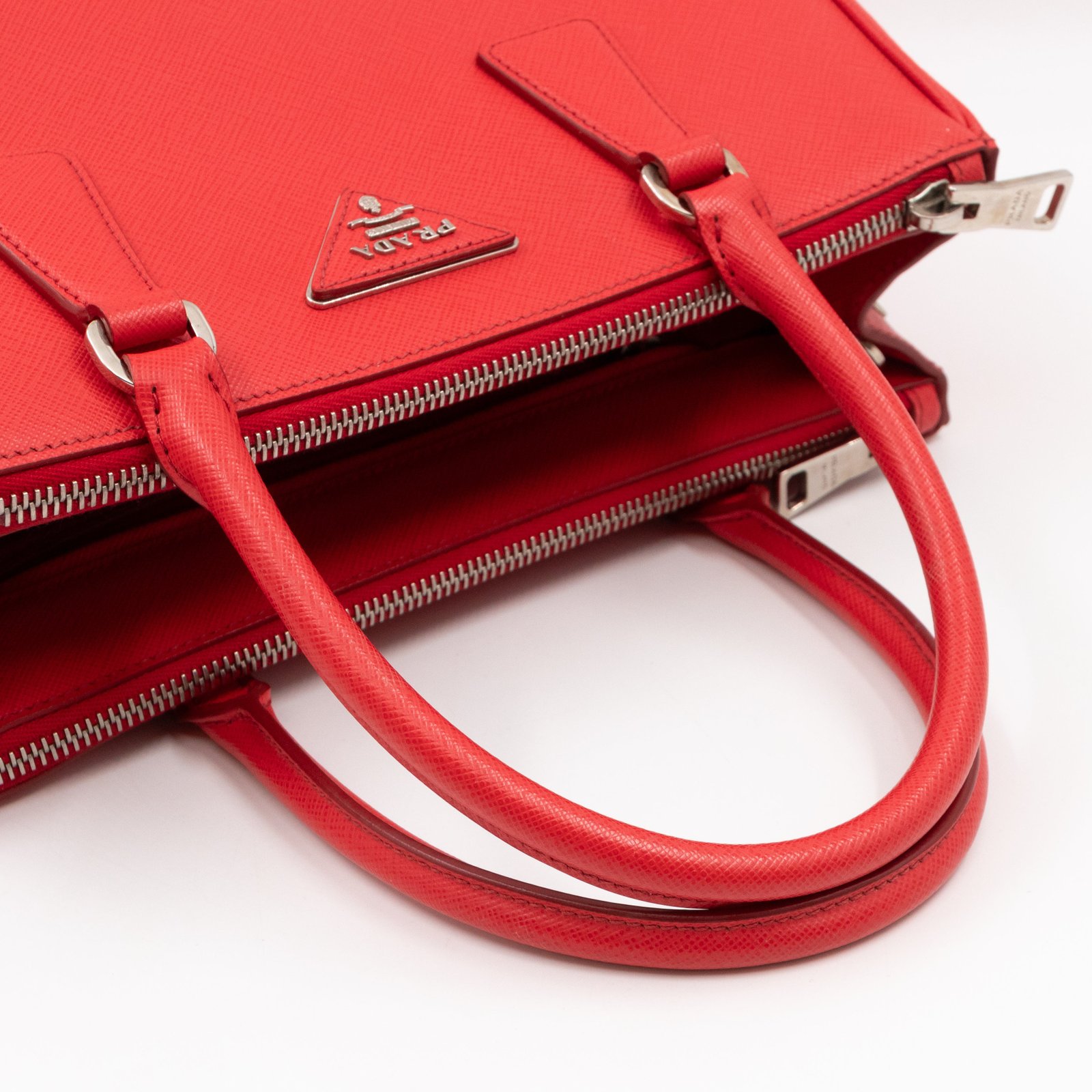 A Prada Galleria Medium Double Zip bag in durable Saffiano leather. Very convenient double zipper bag in nice lacca red color, combined with silver-tone hardware. This medium edition size fits your phone, wallet, documents and so on, even a smaller laptop or iPad fits nicely. Great choice for daily use. Each side has zipper pockets, the middle compartment expands to a spacious size. Current retail price €3700.