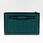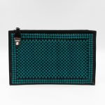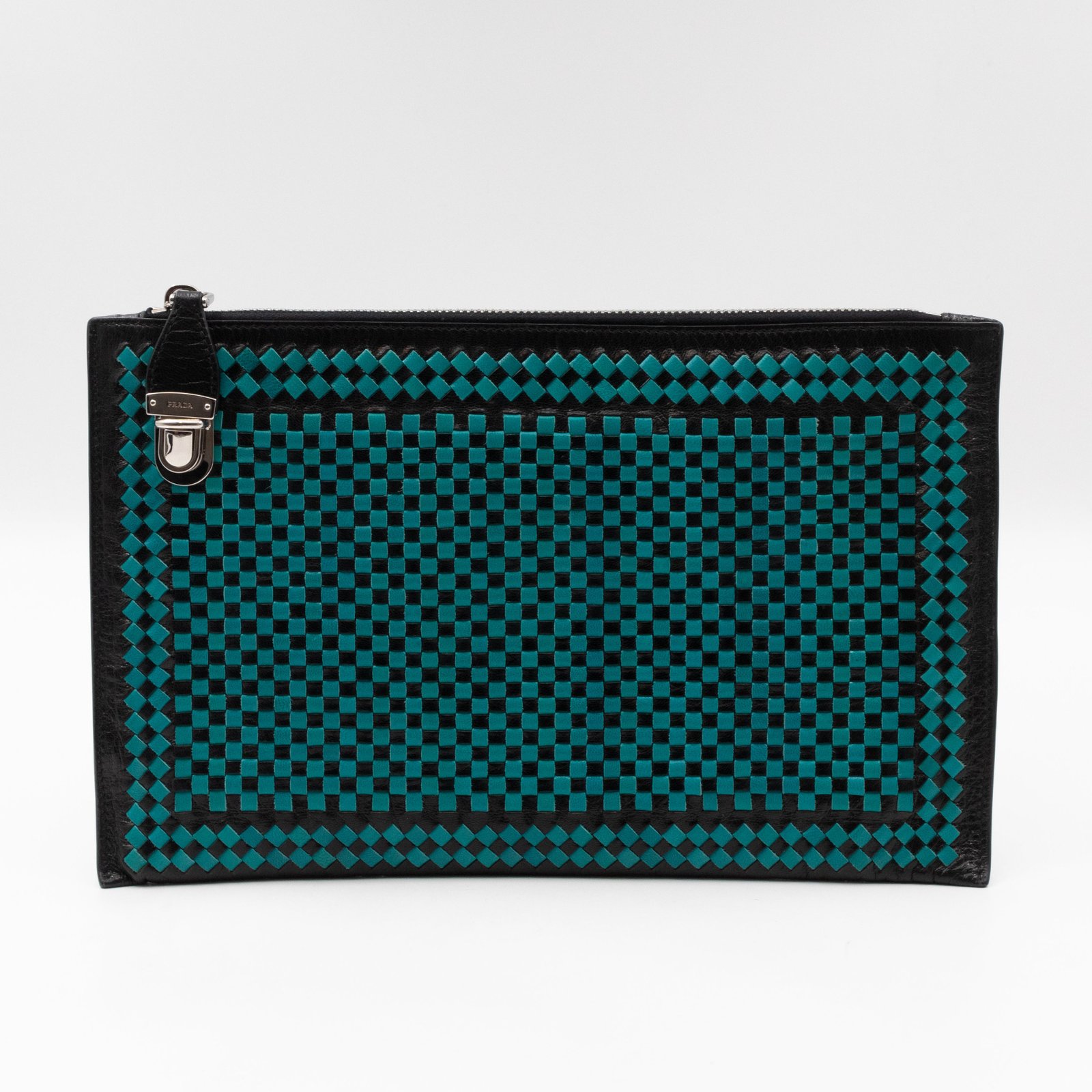 This is a madras woven clutch from Prada. It is made with leather in turquoise and black color, features a wrist strap on one side, and with a silver-tone Prada logo on the zip. The zip can be inserted into the front buckle. The interior is spacious enough with a zipper pocket. There is a handle on the back to carry it more easily. A good choice for an evening event.