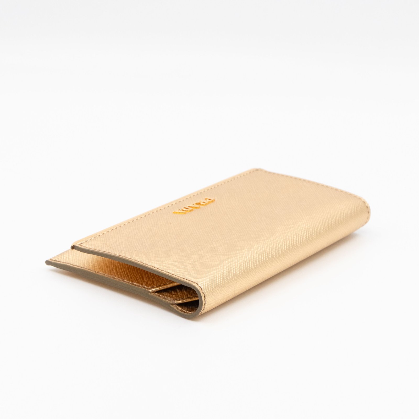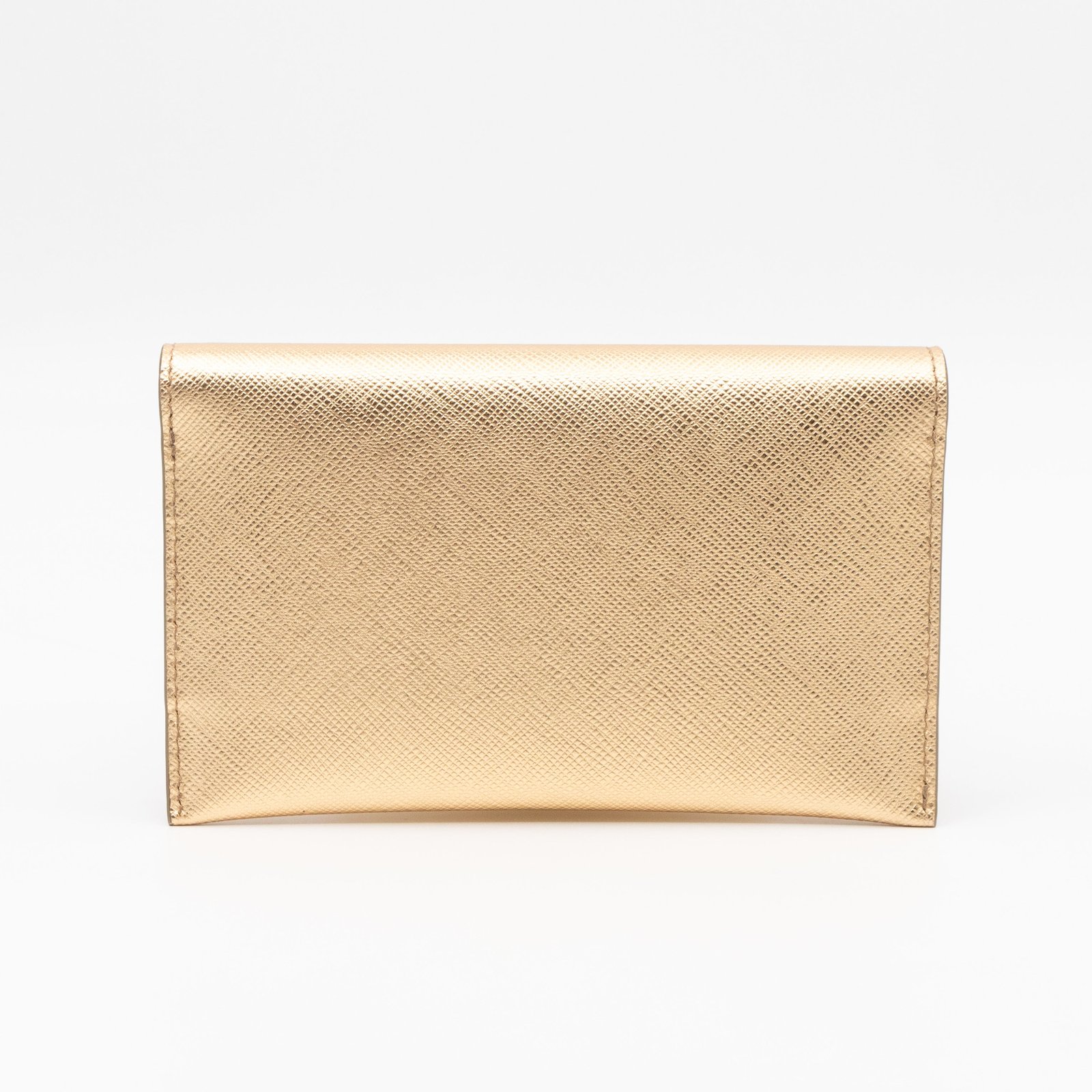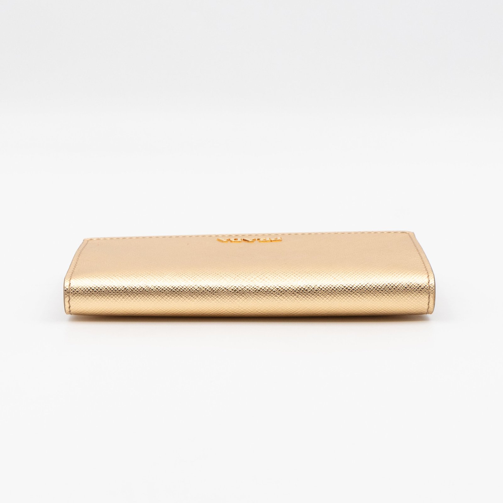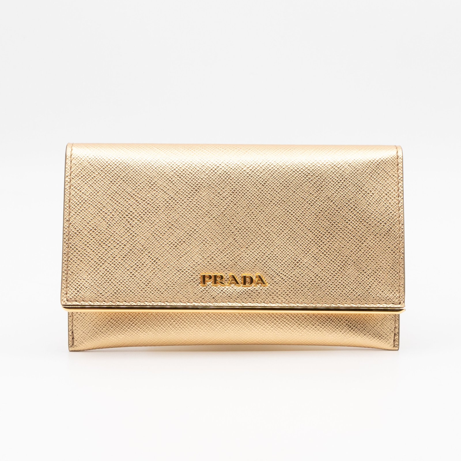 A Metal Saffiano Wallet from Prada. This everyday accessory is made with gold mental color saffiano shine leather and gold-tone hardware. Opens to matching gold leather with an independent card holder and two patch pockets, perfect for organizing small items, providing both style and practicality.Â