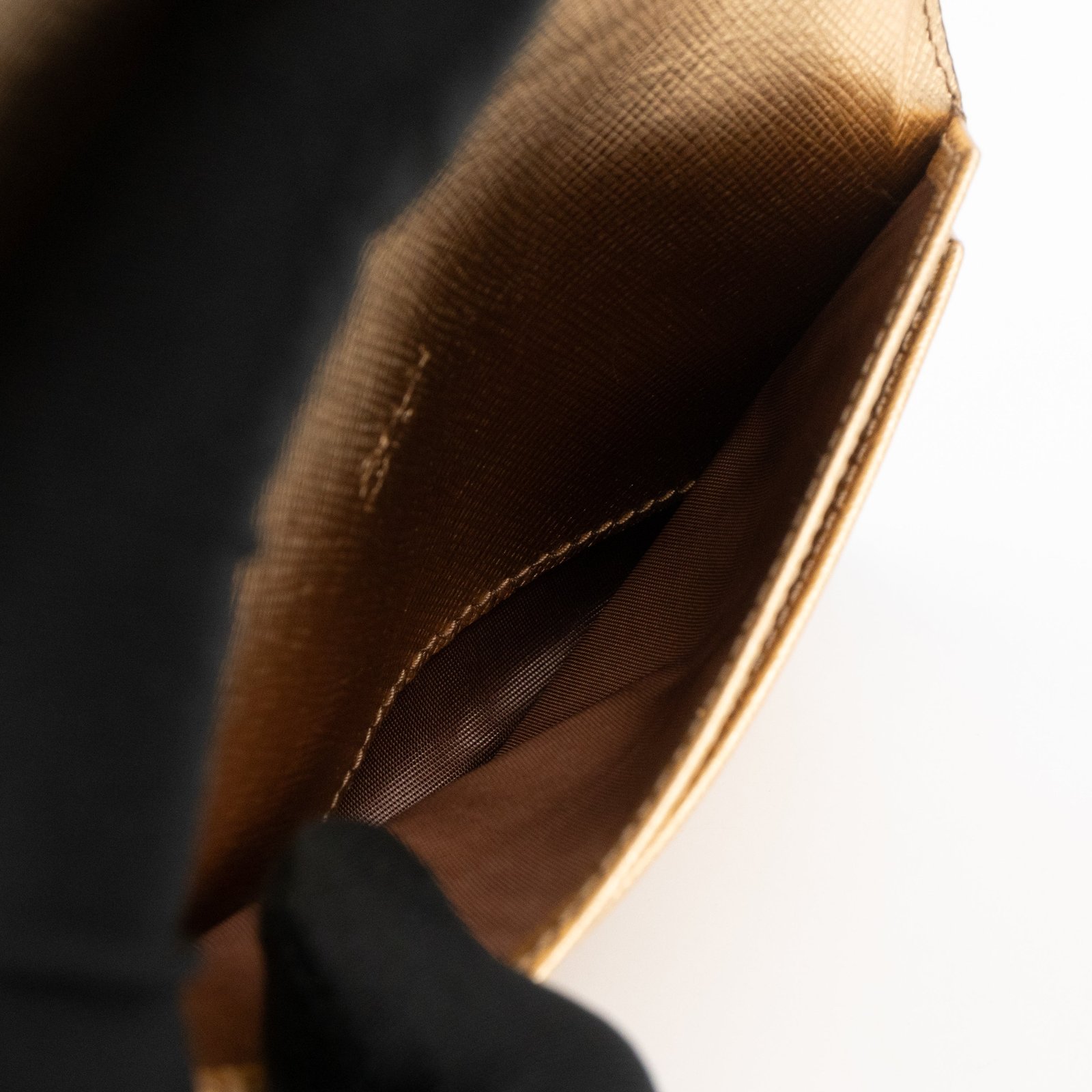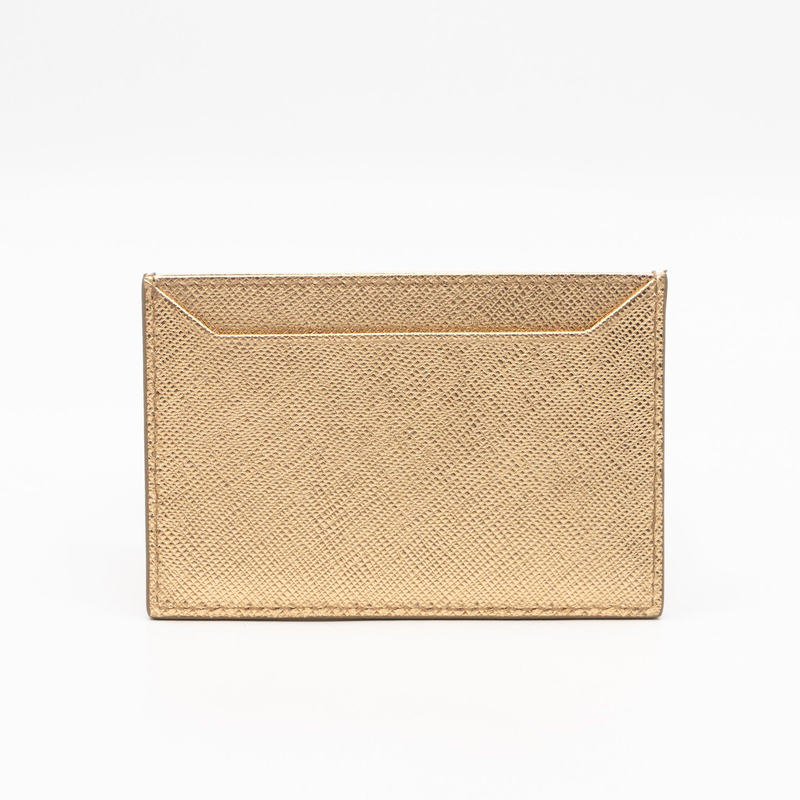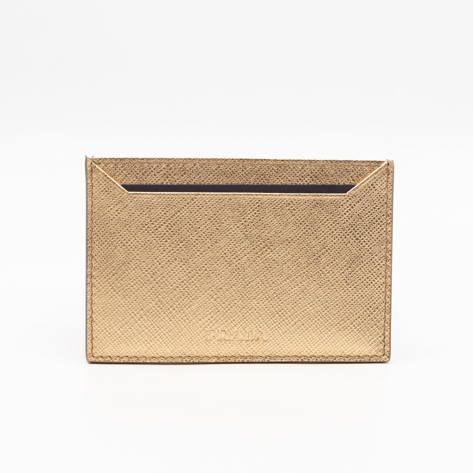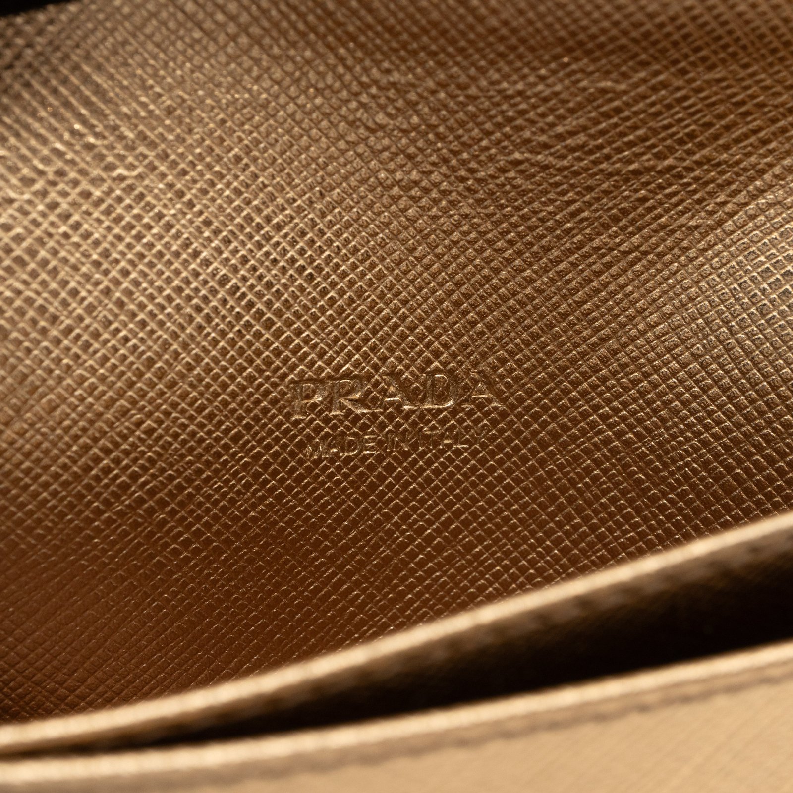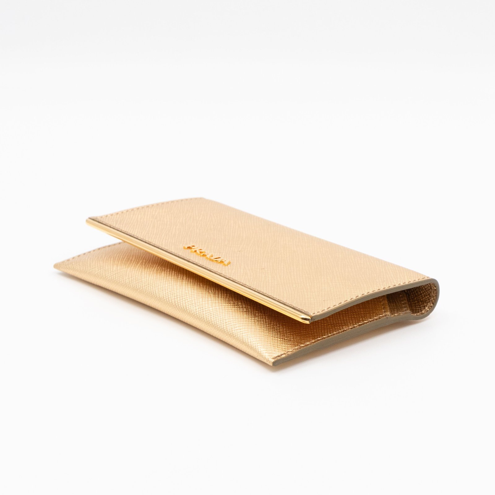 A Metal Saffiano Wallet from Prada. This everyday accessory is made with gold mental color saffiano shine leather and gold-tone hardware. Opens to matching gold leather with an independent card holder and two patch pockets, perfect for organizing small items, providing both style and practicality.Â
