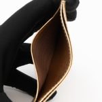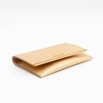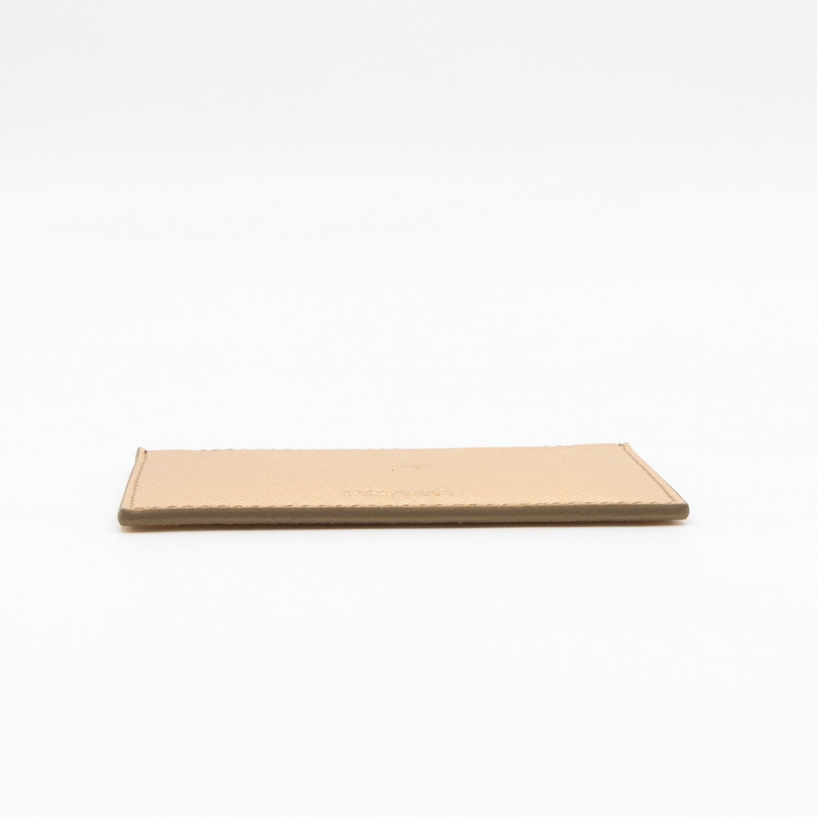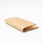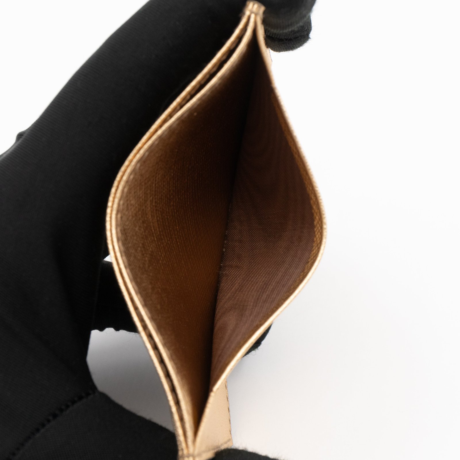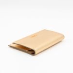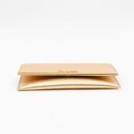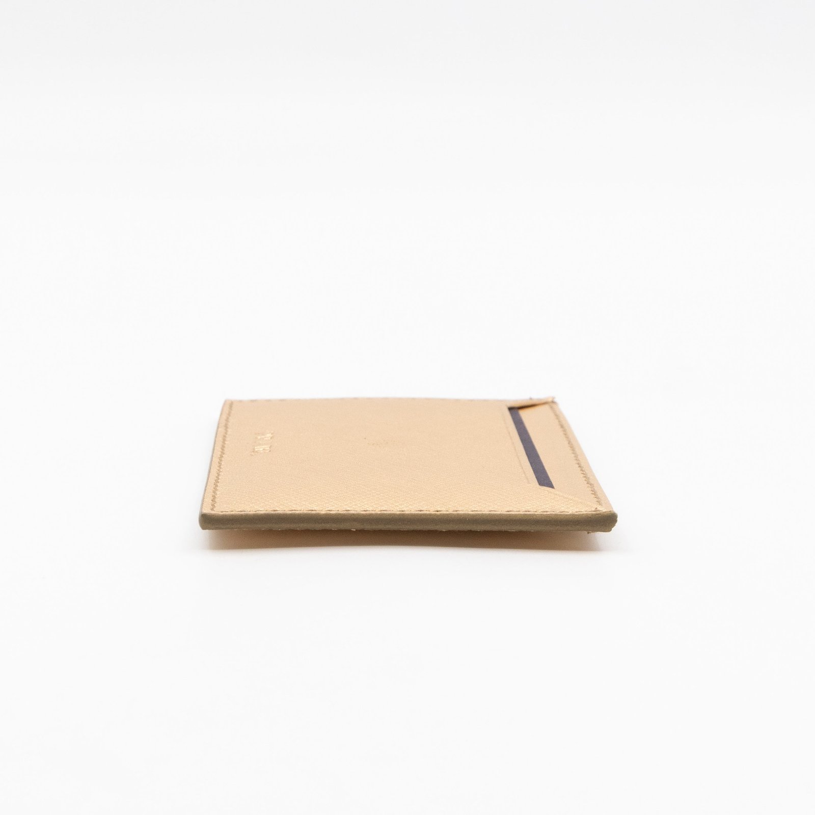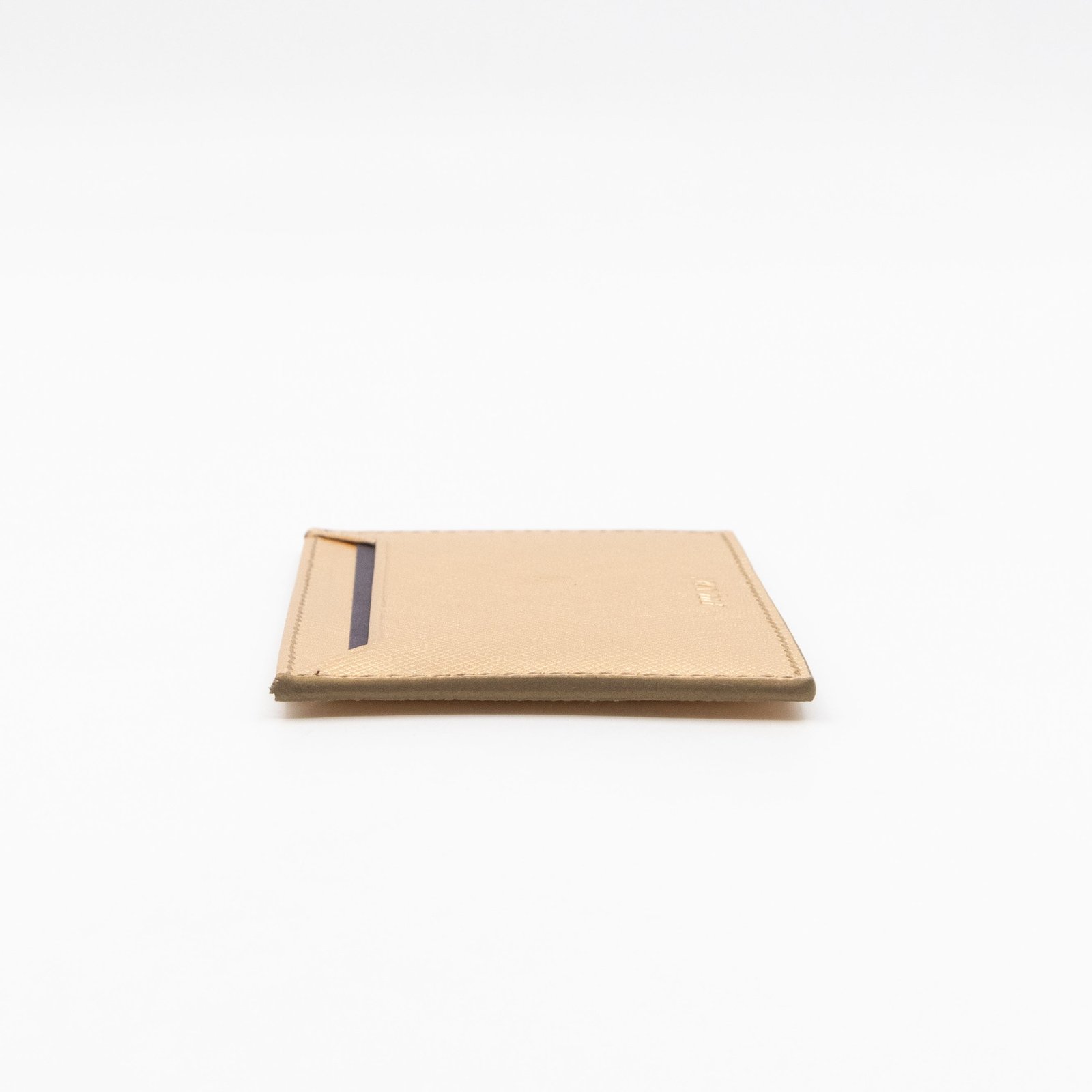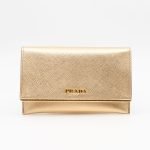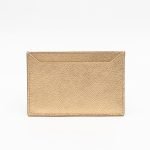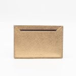 A Metal Saffiano Wallet from Prada. This everyday accessory is made with gold mental color saffiano shine leather and gold-tone hardware. Opens to matching gold leather with an independent card holder and two patch pockets, perfect for organizing small items, providing both style and practicality.Â
