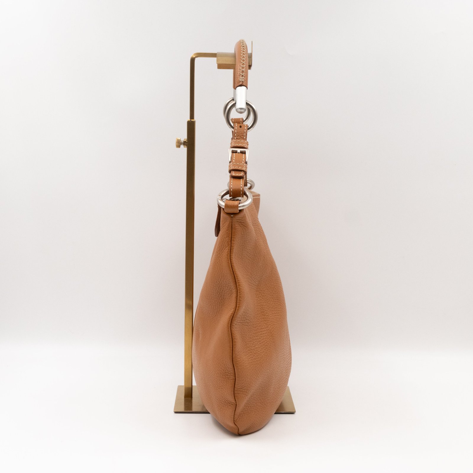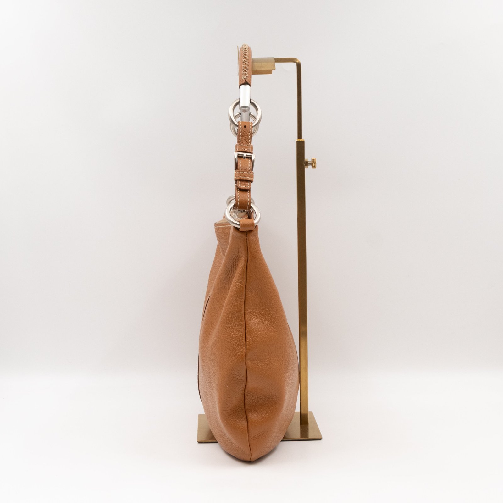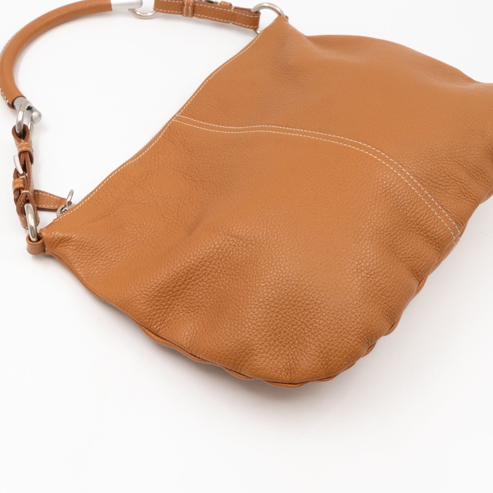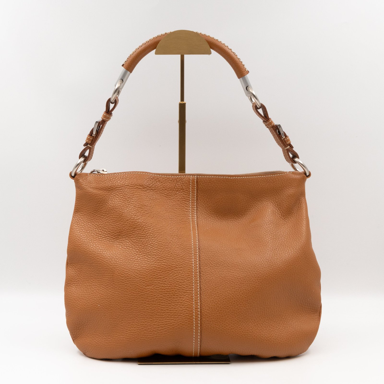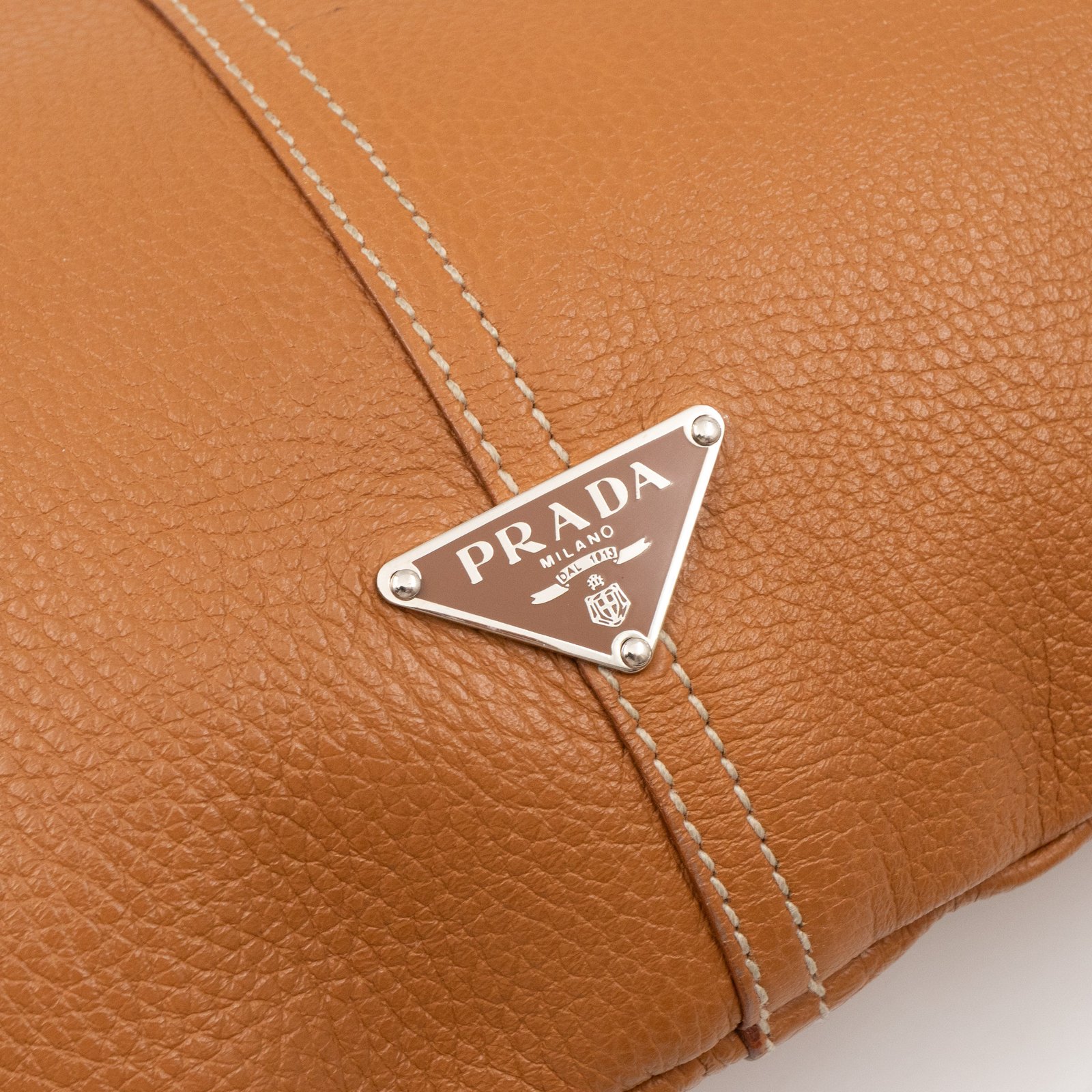 This is a pretty Prada shoulder bag. Very convenient shoulder bag in a brown leather, combined with silver-tone hardware. Top zipper open to a zipper pocket. Great choice for daily use.