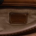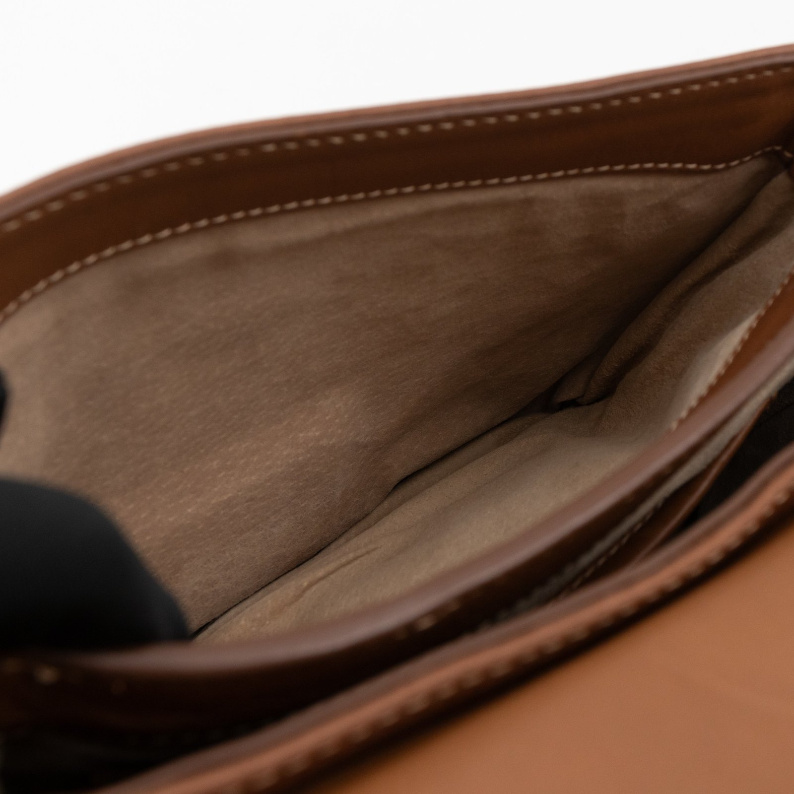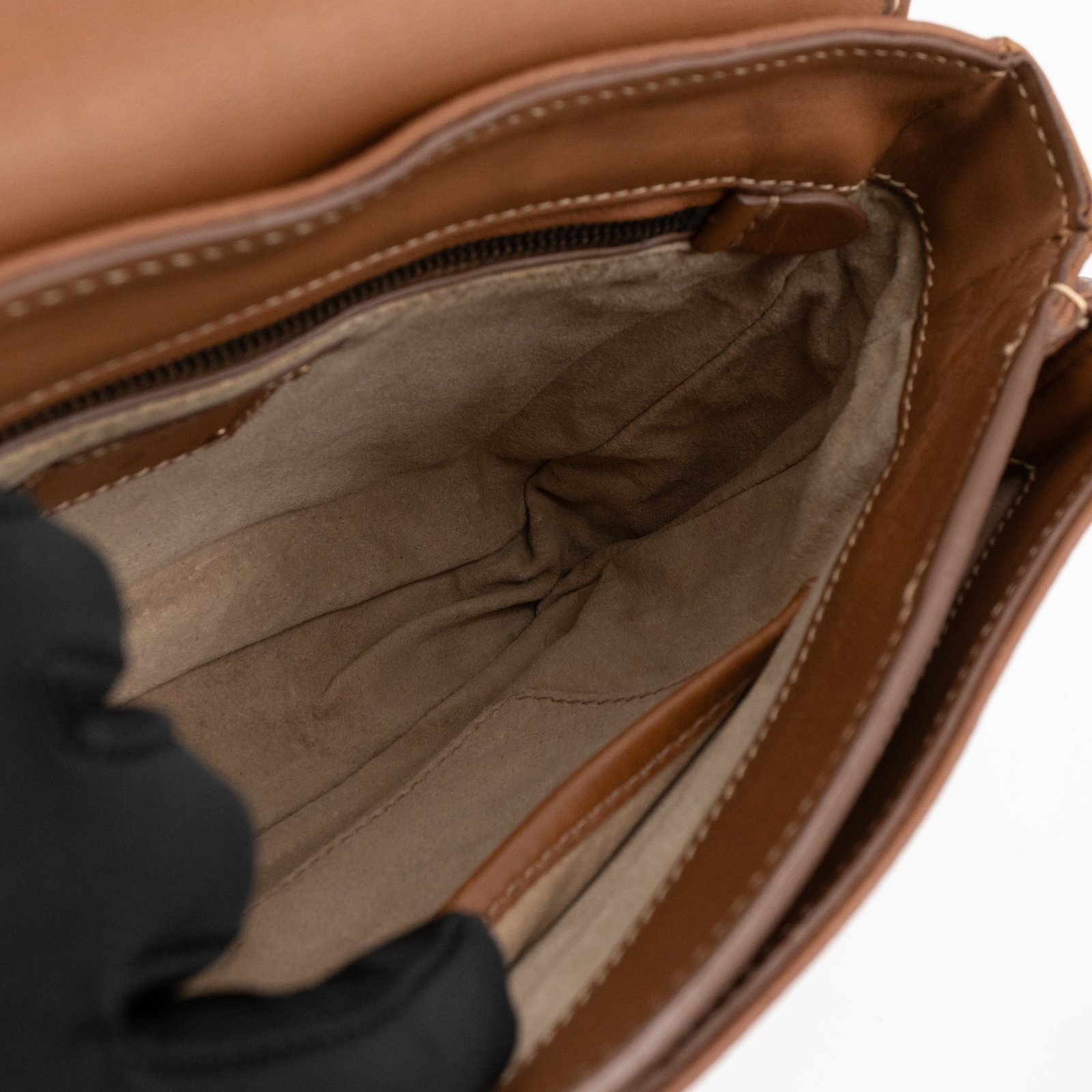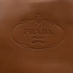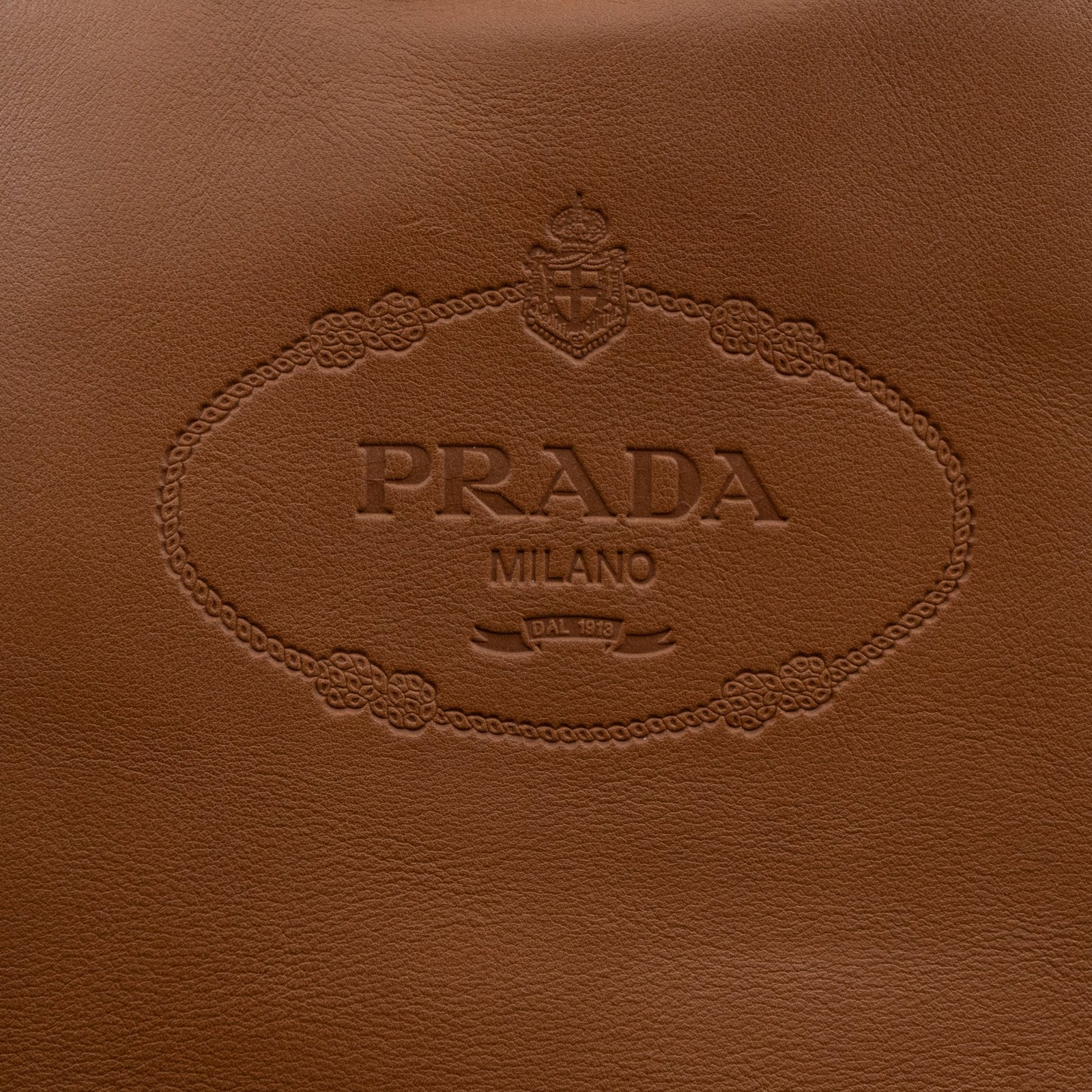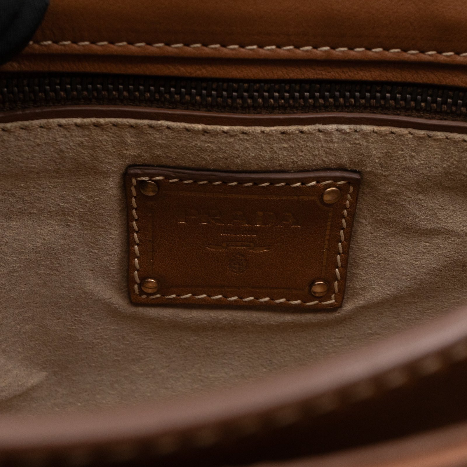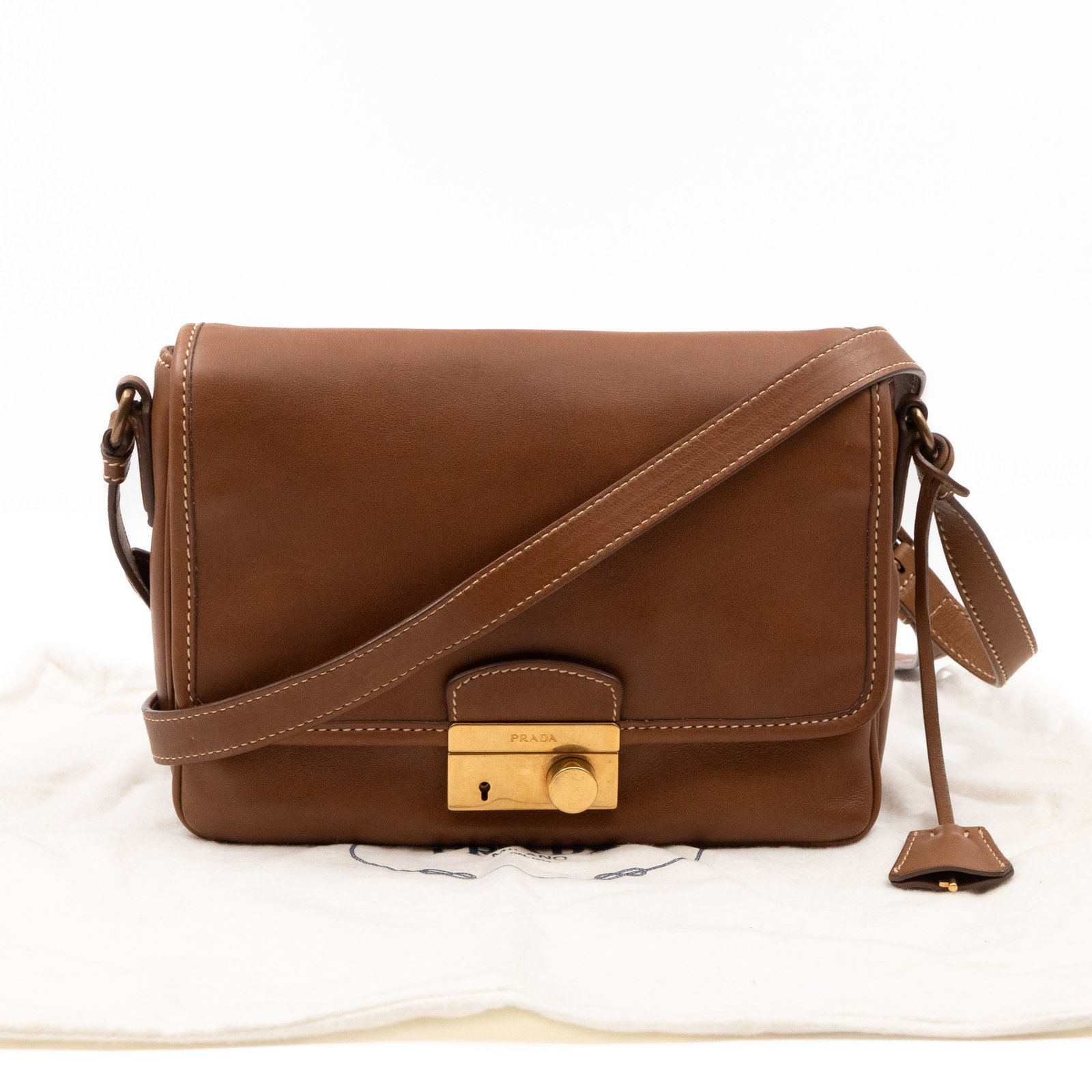 This is a Prada Sound flap crossbody bag. Made in brown leather. The bag features a gold-tone metal press lock and a leather shoulder strap. The flap opens to two compartments and all of which are natural canvas. Shoulder strap can be carried on the shoulder or crossbody.