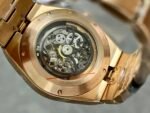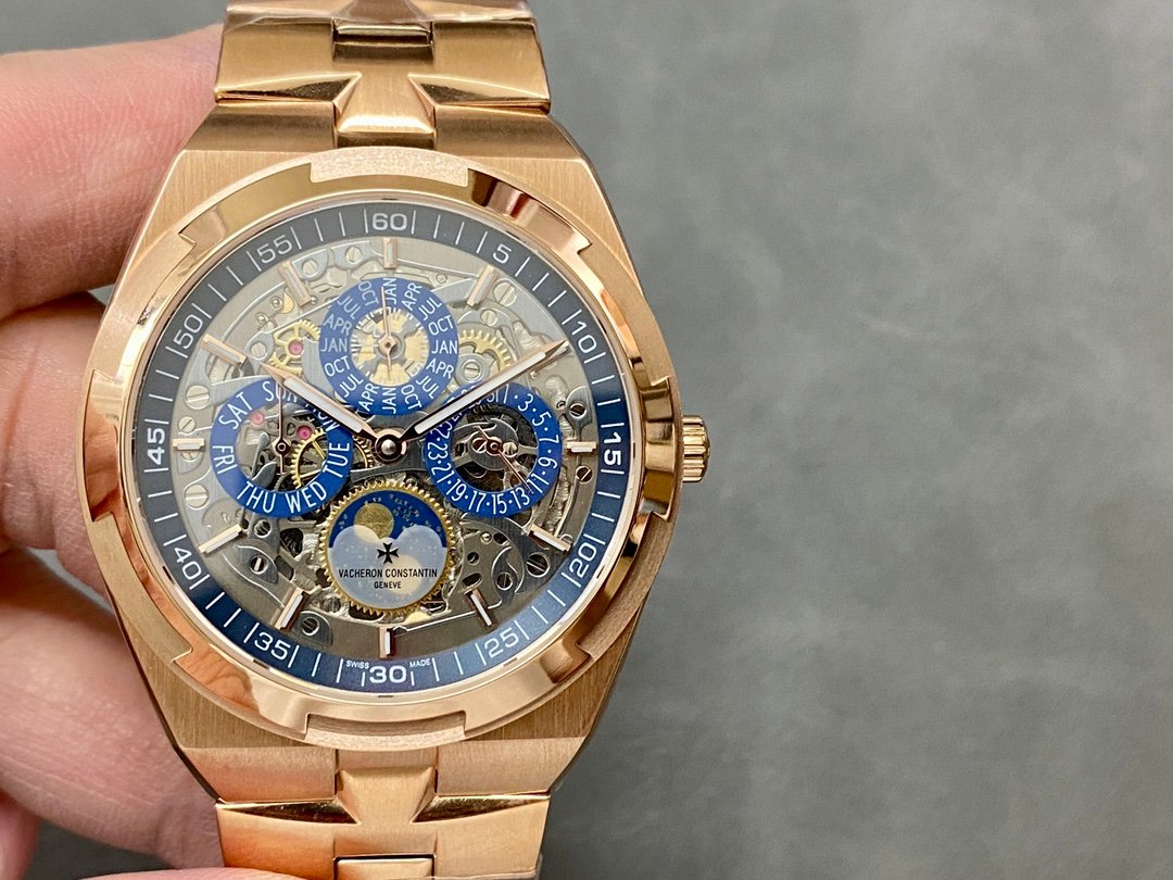 This perpetual calendar watch is powered by the Cal.1120QP movement, identical to the genuine model. It features the signature Overseas oscillating weight and includes functions such as date, day, month, and moon phase, all of which are fully operational. The dial has a 41.5mm diameter, with sapphire crystals on both the front and back. It boasts a sunburst satin-brushed dial with minute markers on the inner bezel, and it is equipped with strong luminous markers for easy readability.
