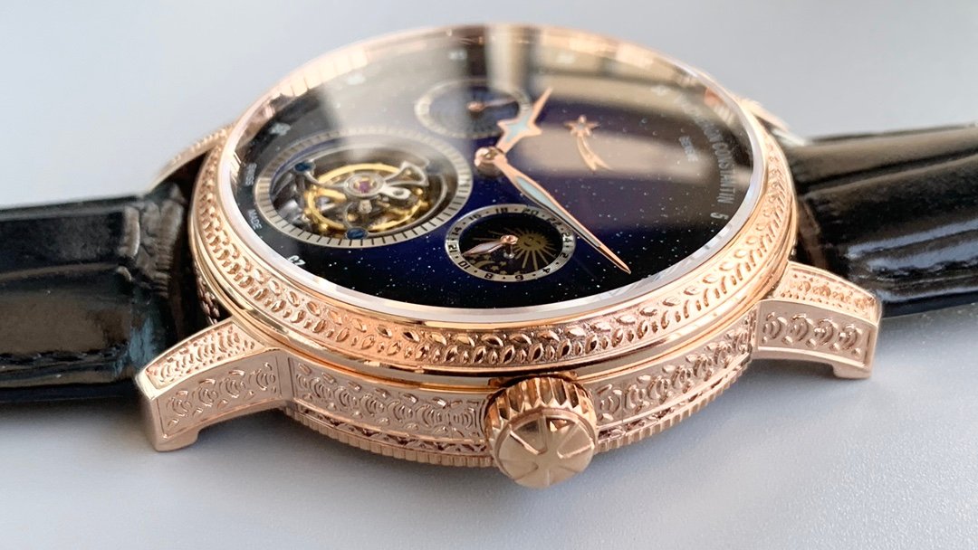 Featuring a fully automatic true tourbillon movement, double-sided blue sapphire crystal glass, and multifunctional day, moon, star phase calendar with power reserve display.